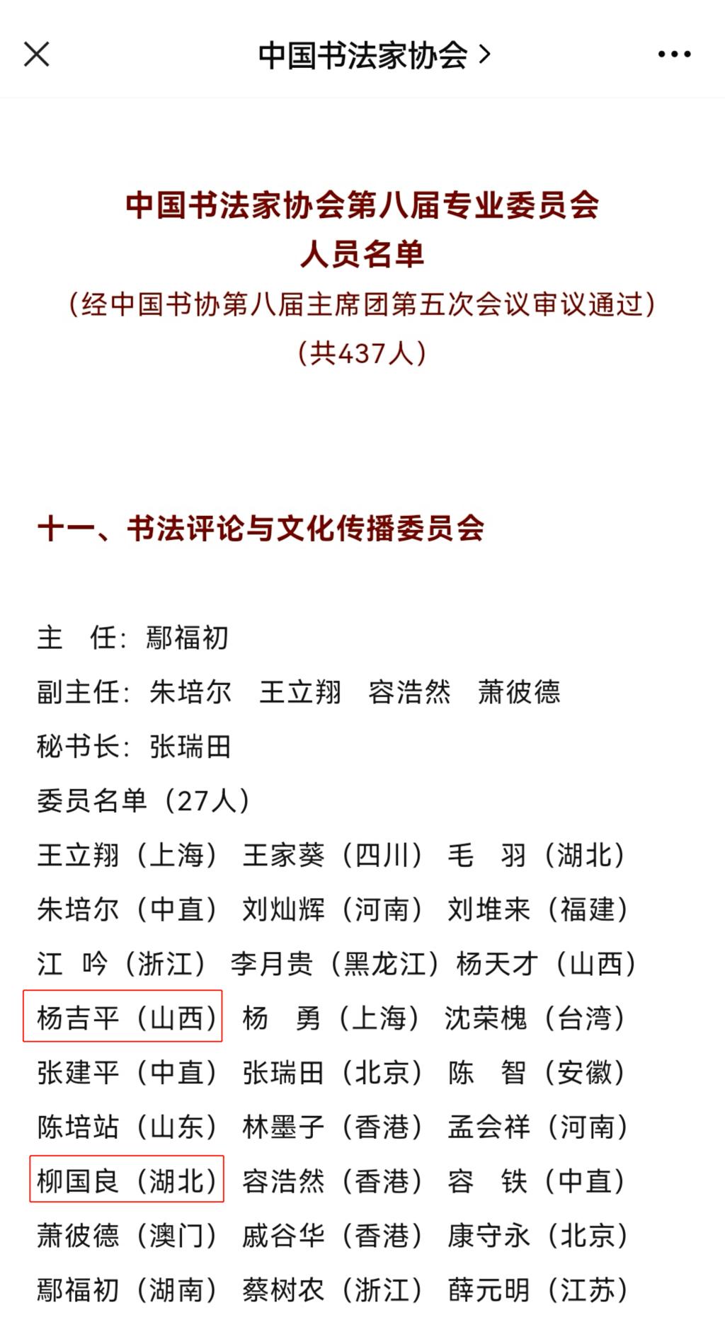 4月30日,中国书法家协会第八届主席团第五次会议审议通过中国书法家协会第八届专业委员会人选名单,山西省共8人当选。其中我院杨吉平教授当选为书法评论与文化传播委员会委员。