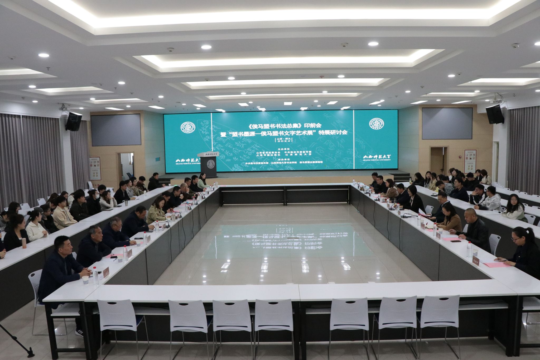 3月29日,《侯马盟书书法总集》印前会暨“盟书墨源——侯马盟书文字艺术展”特展研讨会在我校举行,我校党委副书记、校长许小红,校党委副书记王志强,校社科部副部长赵秀芳,山西省书法家协会主席石跃峰,副主席靳忠、冀卫东,晋中学院党委副书记薛珠峰,上海书画出版社总编田松青、《书法》杂志副主编杨勇、技术部主任顾杰,临汾市委宣传部常务副部长石莹,侯马市委常委、宣传部长郭建伟,侯马晋国古都博物馆馆长高青山,侯马市书法家协会主席王雨生出席研讨会。我校蜜桃堂