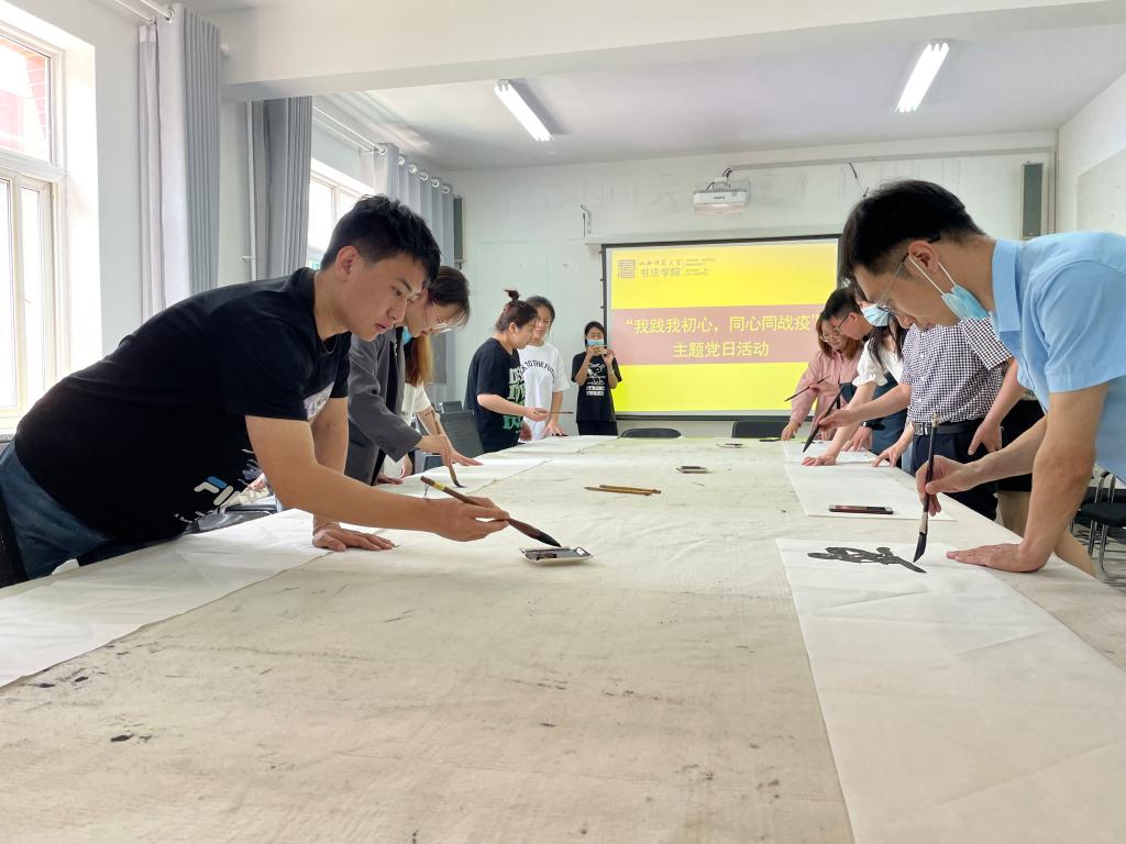 活动过程中,翰墨传薪党支部书记杨二斌副教授带领全体党员进一步学习领会了党的十九届六中全会精神和习近平总书记关于疫情防控的重要讲话重要指示精神,强调全体师生党员在疫情防控的重要关头与关键时期,要听从党的召唤、党的指挥,积极担当作为,发挥党员先锋模范作用,同心协力抗击疫情;接下来,教工党员王文清、李浩锐、宁译锐和学生党员樊雅菁、陈雯鹏结合自身的疫情防控志愿服务经历分享了对疫情防控工作的认识和体会,他们的发言使在场师生党员进一步深刻感受到了学校师生为抗击疫情所做出的努力与奉献;最后,师生党员共同书写了抗疫主题书法作品,用自己手中的毛笔向疫情防控工作人员致敬,表达抗疫必胜信念。