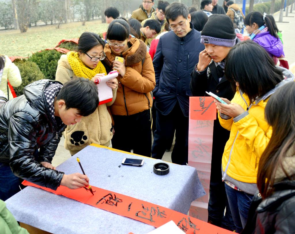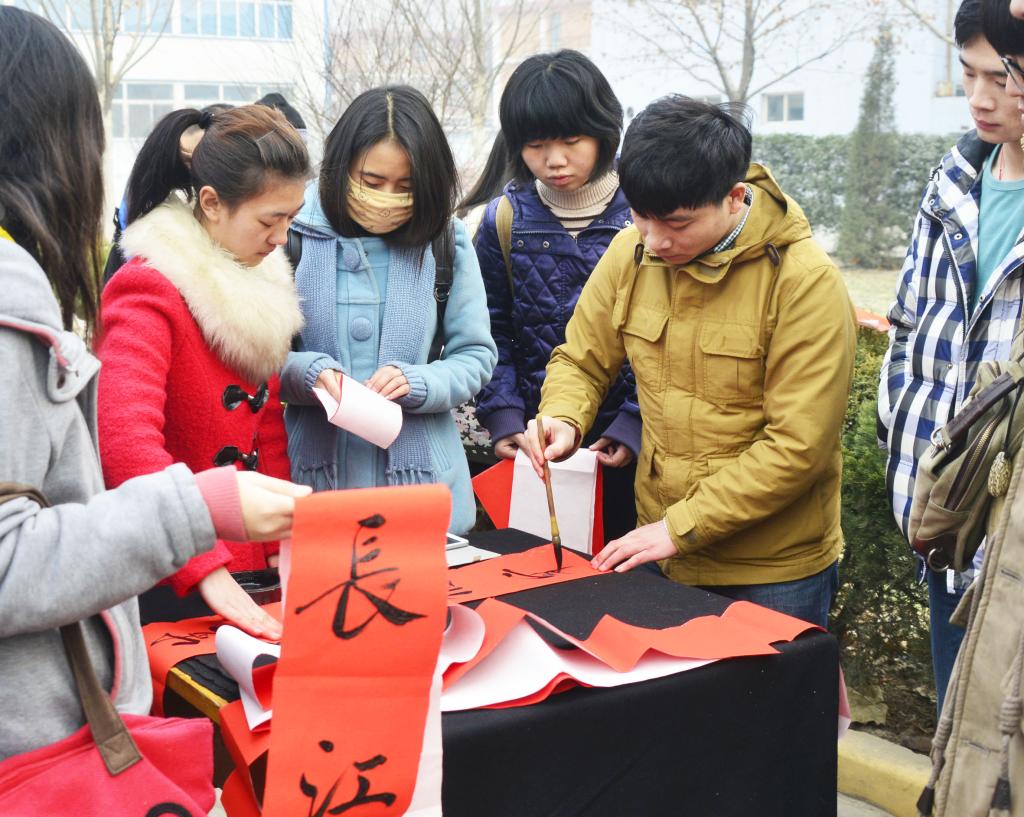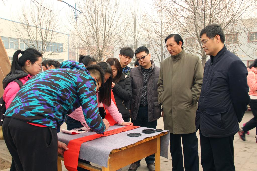 活动一开始便吸引了众多老师和同学驻足观看,春联内容丰富多彩,或是对新年的祝福,或是对一年的总结,或是对来年学习生活的希冀,“骏马辞年不懈奔腾千里志,吉羊献岁同迎欢乐万家春”,“百世岁月当代好,千古江山今朝新”,“旧岁又添几个喜,新年更上一层楼”,“马嘶飞雪里,羊舞画图中”……一幅幅充满诗意、散发着墨香的春联展现在大家面前,现场洋溢着浓浓的年味。