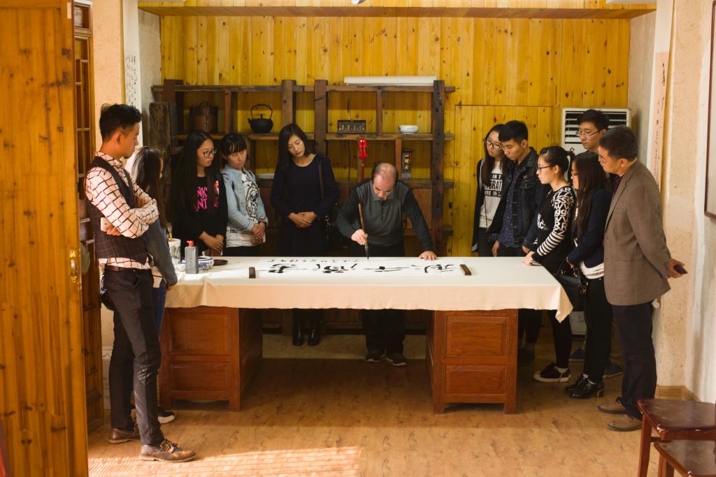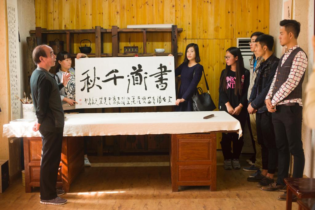 75岁高龄的樊习一先生精神矍铄,为大学生们讲述了自己往昔的学书经历、在艺术实践中的认识和感悟,并对同学们在专业理想、人生规划等方面提出了殷切期望。他说,如今学习书法的条件和环境非常好,同学们选择书法专业是幸福和幸运的,一定要珍惜大学时光,合理安排时间,学有所成,今后为书法教育和书法事业的发展贡献力量。他强调,书法是国粹,切勿以书法为“小道”,要多读书,多研习,才能真正领悟书法真谛。他还现场书写了“书道千秋”四个大字,勉励同学们把书法艺术作为优秀文化传承的“大道”精研深修,继承创新。