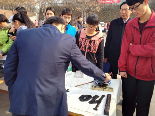 为了响应我校宿舍文化节,我院书法爱好者联谊会于2015年12月12日上午在校医院门口,组织我院优秀学生为全校师生义务书写书法作品。活动一开始便引起了广大师生的驻足,活动期间我校原副校长李振中也到活动现场参加活动并题字祝贺,表达了对我院学生传承书法文化的殷切期盼。我校副校长原战勇,也到达活动现场,观看同学们书写作品。此次活动共计为全校师生免费送出优秀书法作品500余幅,在丰富全校学生宿舍文化生活的同时也为展现我院书法爱好者联谊会的精神风貌起到了良好的作用。