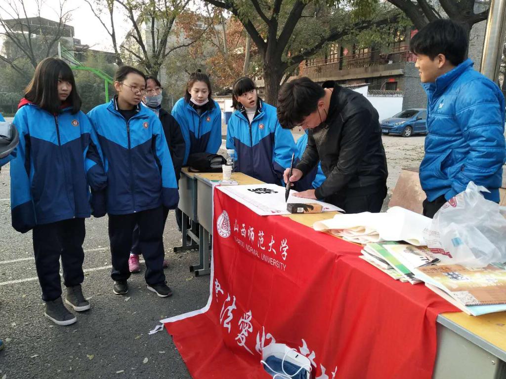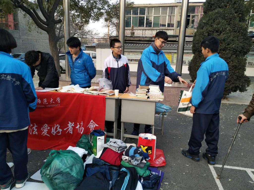本次活动主要在师大实验中学校内进行,活动参与者可通过捐献自己的旧书籍、文具、衣物等与我们的志愿者交回一幅书法作品。活动现场,实验中学的学生们踊跃参与,积极募捐,纷纷为贫困山区的孩子们献上自己的一份爱心。活动最后书法爱好者协会主席武文斌现场书写“高考加油”四个大字,祝福实验中学学子能步入自己理想的大学。