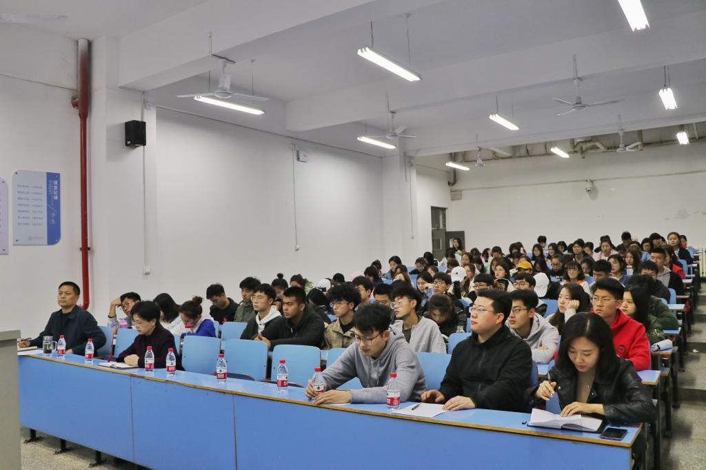 贾教授首先讲述了习近平总书记在庆祝改革开放四十周年大会上重要讲话的时代背景,从宏大的历史背景出发,阐释了改革开放的重要性。随后从“四个基于”“两个伟大”“三大里程碑”“三次飞跃”“三个充分证明”“十个始终坚持”“九个必须坚持”等方面详细解读了讲话内容,带领师生一起学习了伟大的改革开放精神。接着,针对大学生学习和生活围绕“六个破除”,分析了当今大学生普遍存在的问题,要求同学们做到“责任担当、抓紧落实、目标方法”这三个方面,学会自我反思、自我革新,养成良好的学习和生活习惯,及早树立标杆,追赶一流。