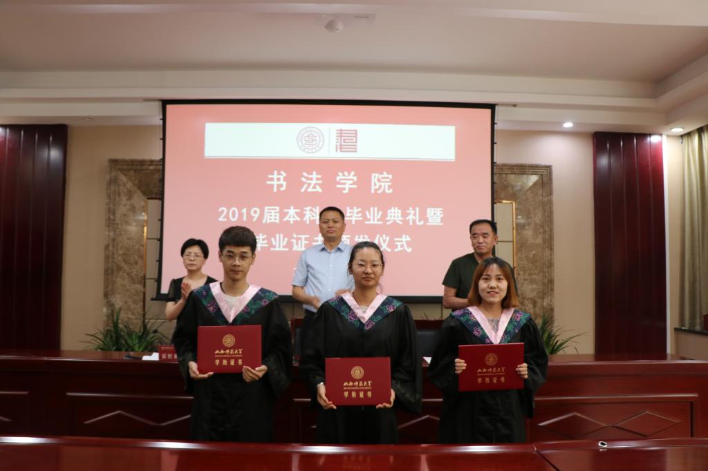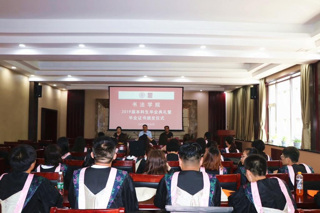 最后,许国宝书记深情寄语全体毕业生:一是要热爱祖国、树立远大理想,将自己的小我融入祖国的大我。同学们只有志存高远,才能在人生道路上激发自己的奋斗潜力,升华自己的人生价值,让青春在奋斗中闪光;二是要持续努力。希望同学们时刻保持危机感,耐得住寂寞,勇于约束自身,让持续努力成为一种习惯;三是要担当时代责任,在担当中历练,在尽责中成长,脚踏实地、持之以恒,勇立时代潮头,争做时代先锋。大家走出学校后将肩负起传播书法文化的重任,希望全体毕业生坚守本心、保持本真,真正将书法文化发扬光大;四是要不断学习,练就过硬本领。毕业不是学习的结束,而是另一段学习的开始。特别是作为书法专业的学生,在毕业后要坚持每天练习,向社会学习、向名家取经,使自己尽快成为书法领域的专家、学者和大家。