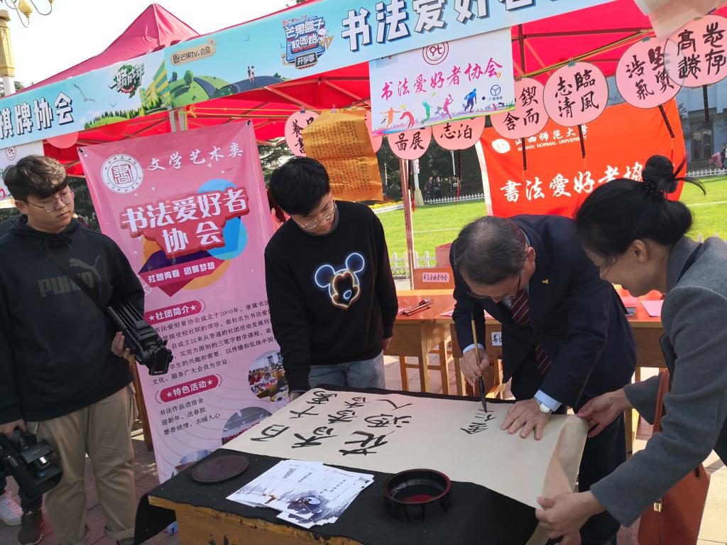 纳新活动过程中,宣传干事积极向前来咨询的学生发放社团宣传册,并向他们解说社团特色活动。在社团进行书法现场展示时,到我校来访的韩国京畿大学校长金仁圭对学生们的书法作品表达了认可和赞扬,并现场题字鼓励大学生珍惜大学时光。校社联秘书长、音乐学院团委副书记郭俊平,我院团委副书记宁译锐均到场指导了此次社团纳新活动。本次纳新共纳入624人加入书法爱好者协会。