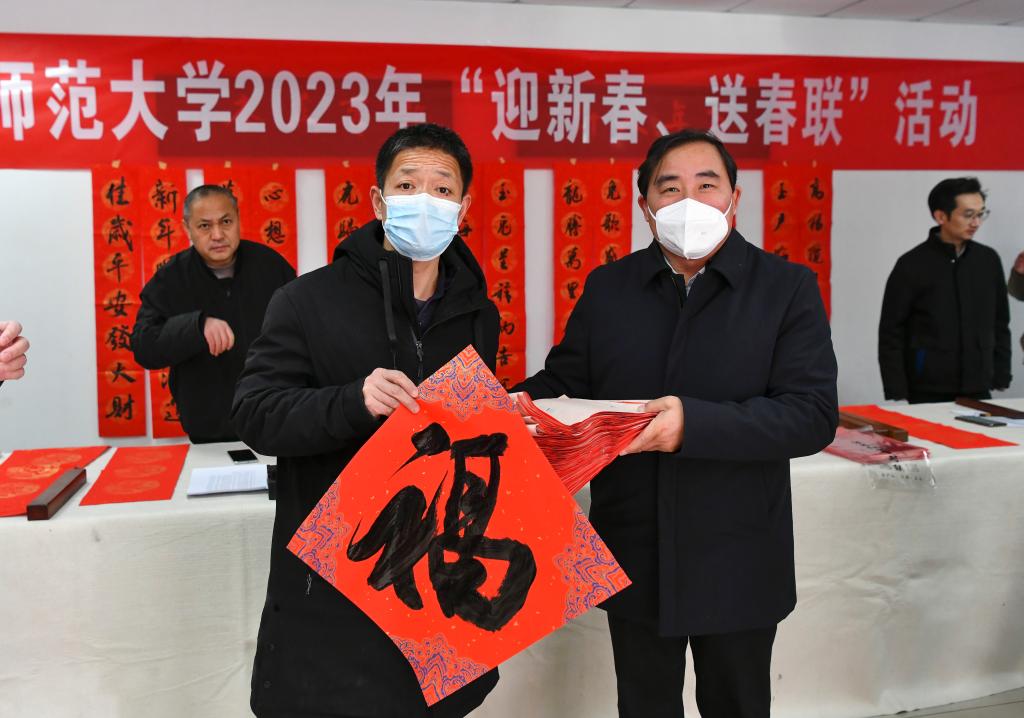 教师亲切交谈,并与大家一道,向保卫部、校医院等部门的一线工作人员送上春联和美好的新春祝福。