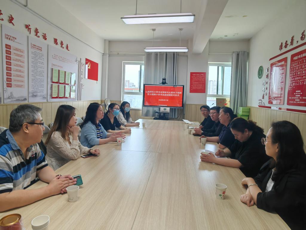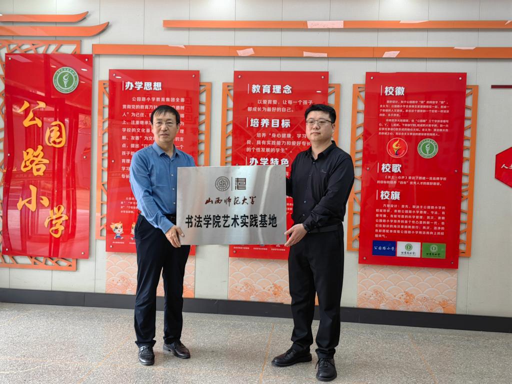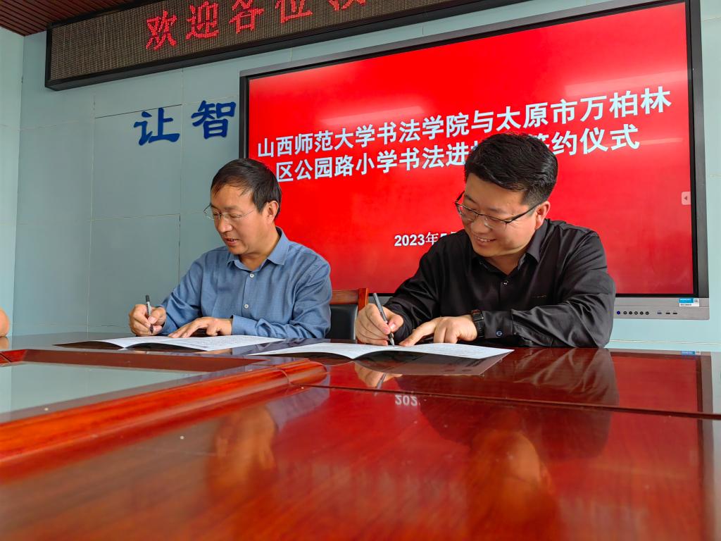 副院长曹亚彬、黄玉岩,理论教研室主任杨二斌和我校教育科学学院一行赴太原市万柏林区公园路小学进行了参观交流,并与太原市万柏林区公园路小学教育集团成功举行了书法进校园签约授牌仪式。