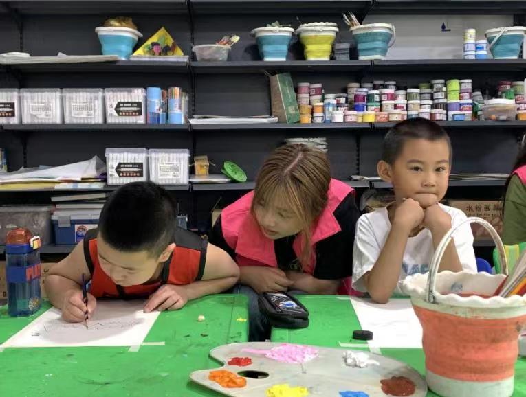 图为志愿者辅导小朋友们绘画。志愿者陈佳摄。