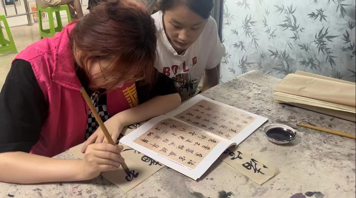 图为志愿者给小朋友示范行书。志愿者武晓雅摄