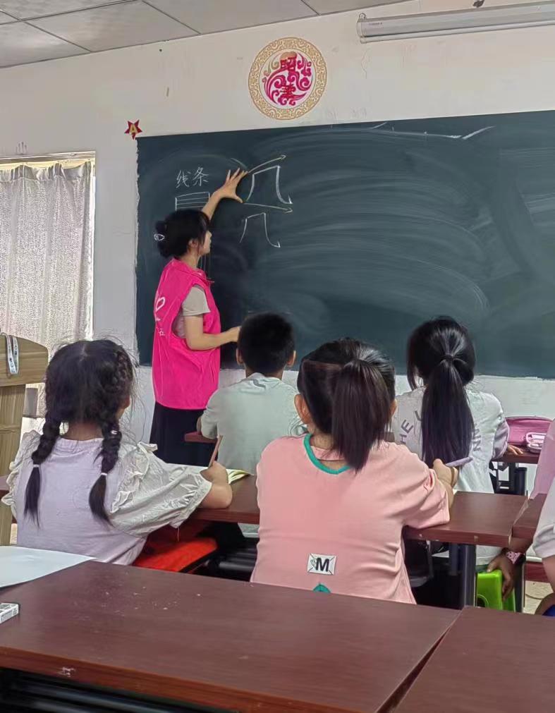 图为志愿者们教孩子们练习硬笔。志愿者陈佳摄。