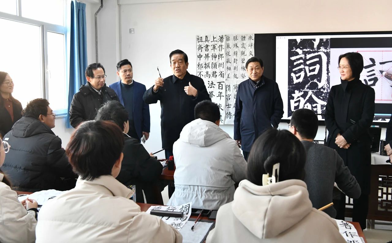 、学校三笔字实训室,了解了相关学科及书法教学发展情况;参观了正在美术馆展出的全国楷书作品展,对我校书法教育教学和人才培养工作予以充分肯定。他指出,汉字书法作为中华传统文化的重要组成部分,对塑造文化自信、提升民族凝聚力、弘扬中国精神、建设文化强国发挥着十分重要的作用。“写好中国字,做好中国人”凸显的不仅是国人对民族文化的热爱和深情,更是中华民族坚守文化自信和走向伟大复兴的文化基因。他表示,近年来,在全国政协和中国书协的积极推动下,书法教育正在逐步走进中小学课堂,汉字在文化传承中的核心作用进一步弘扬。师范生作为未来的人民教师,要不断提升书法素养,传承、弘扬汉字文化,坚定文化自信,为实现“两个一百年”奋斗目标贡献青春力量。