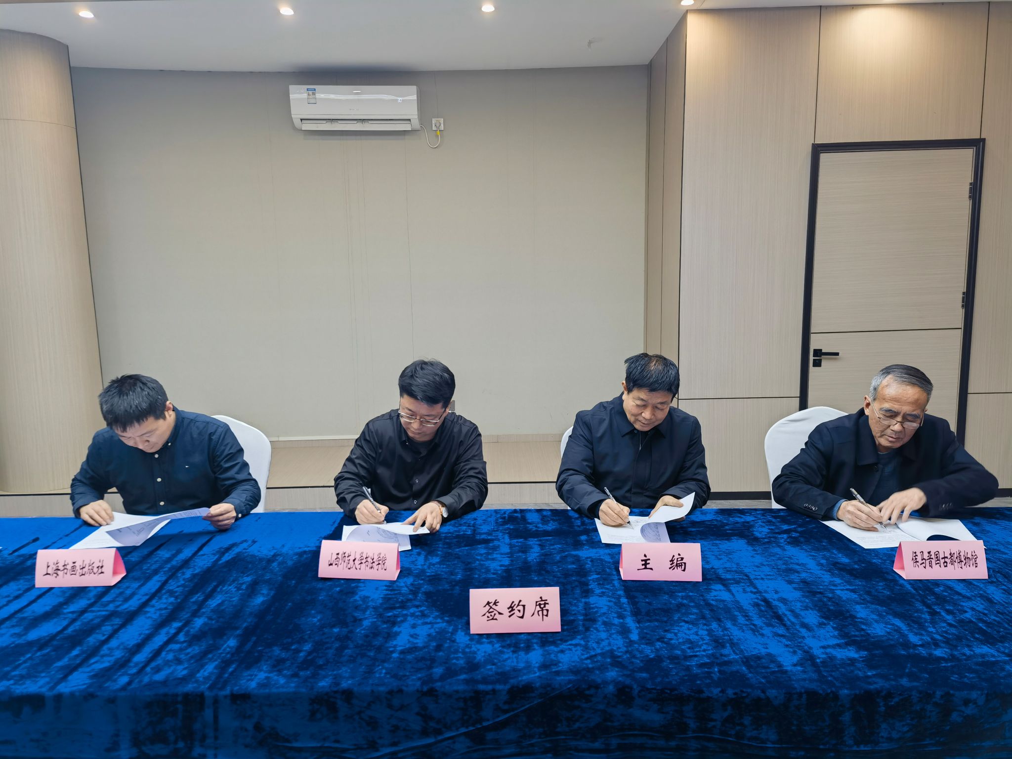 在座谈会举行前夕,12月8日下午,我院副院长(主持行政工作)曹亚彬与侯马盟书研究会名誉会长李朝旗、上海书画出版社副编审、《书法》杂志副主编杨勇、侯马晋国古都博物馆馆长高青山共同签订了《侯马盟书书法总集》出版合同。