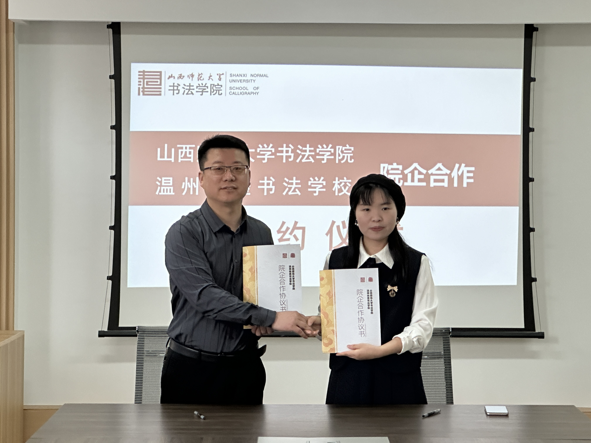 8301会议室举行了院企合作签约仪式。学院党总支书记王志宏、院长曹亚彬、专业教师代表丁俊瑞、团委书记宁译锐,林墨书法学校校长林墨、行政副部长余海艳参加了签约仪式。