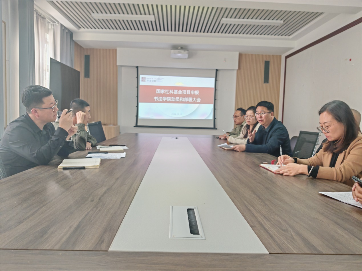 学院院长曹亚彬发表动员讲话。他对学院近年来在国家社科基金及教育部人文社科项目立项方面取得的显著成绩表示了肯定。自2021年以来,学院已经成功立项1项国家社科基金项目、1项教育部人文社会科学规划基金项目以及1项青年基金项目,立项成功率较高,在全国同类学院中处于领先地位,充分展示了学院在书法专业学科建设方面的雄厚实力和卓越成就。他强调,国家社科基金和教育部人文社科项目的申报工作对于提升学院的学术水平和影响力具有重要意义,希望全体教职工积极参与申报工作,充分发挥自己的专业优势和创新能力,为学院的学科建设和学术发展贡献力量。最后,他要求学院相关负责人员要切实做好申报材料的准备和审核工作,确保申报项目的质量和水平。