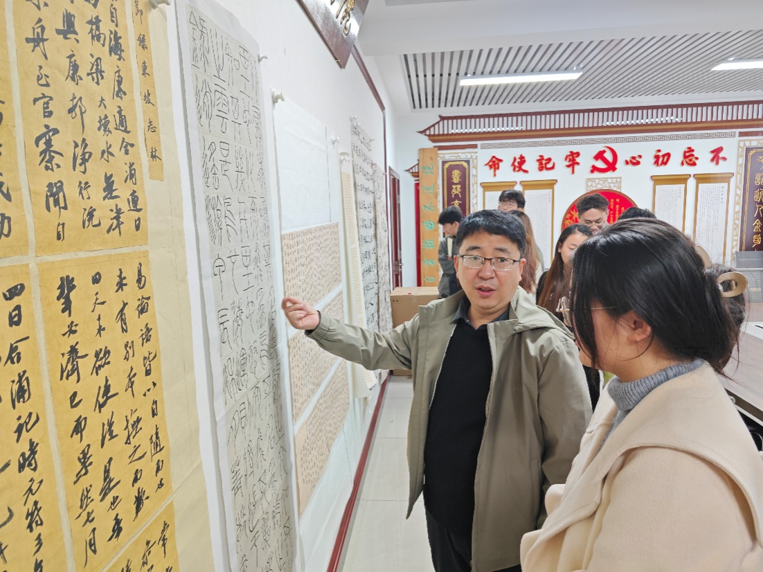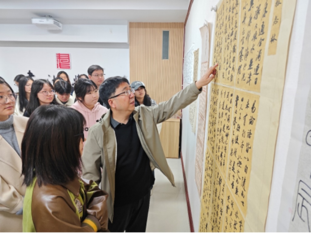 杨二斌导师工作室在学校南区八号教学楼8301会议室召开了本学期第二次书法交流活动,就学生临摹《兰亭序》作品进行了逐一点评并提出修改建议。