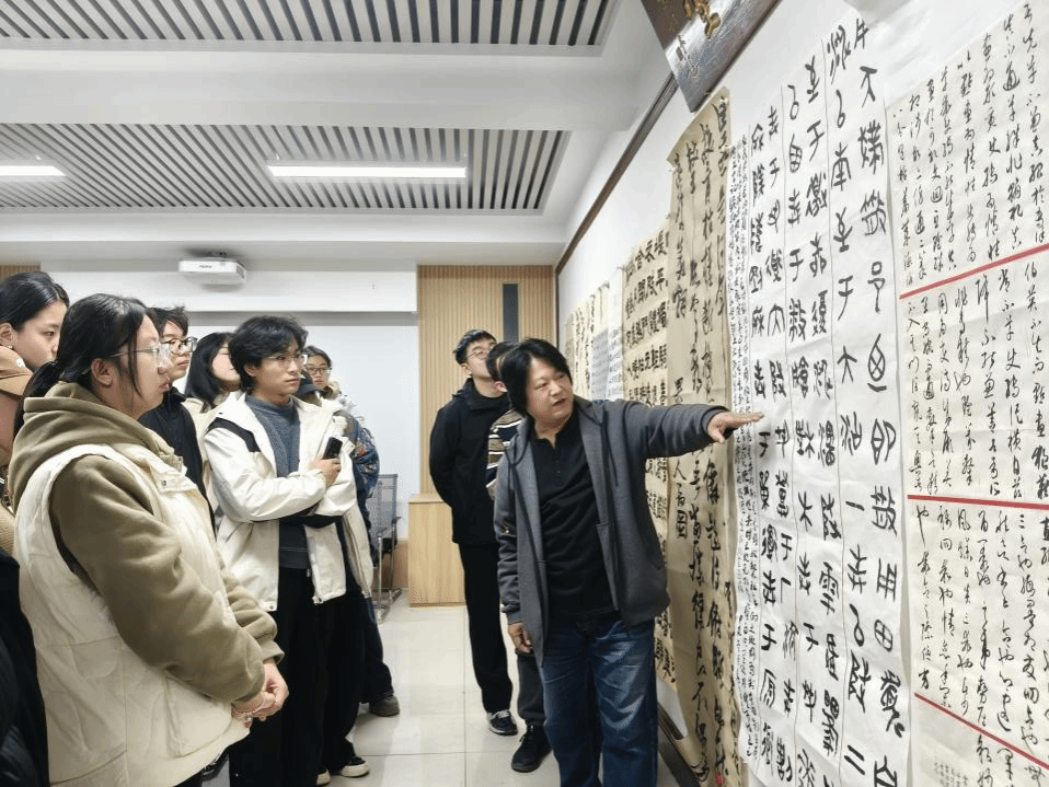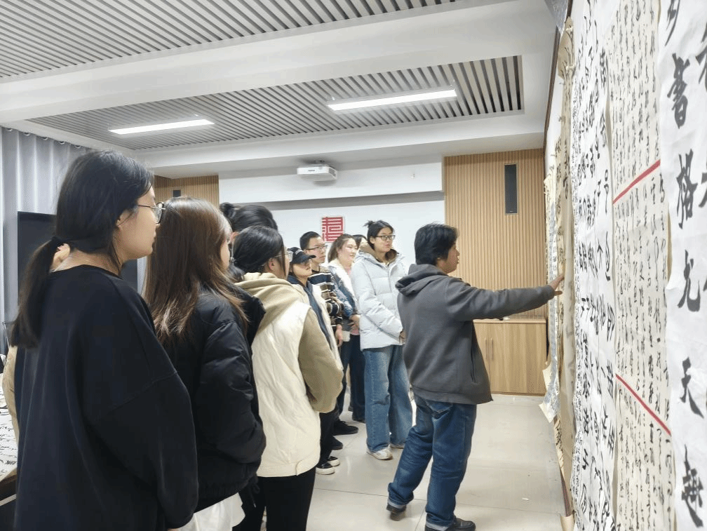 王建魁导师工作室在学校南区八号教学楼8301会议室召开了本学期第五次书法交流活动,对学生的书法临摹与创作作品进行了细致点评,并给出修改意见。