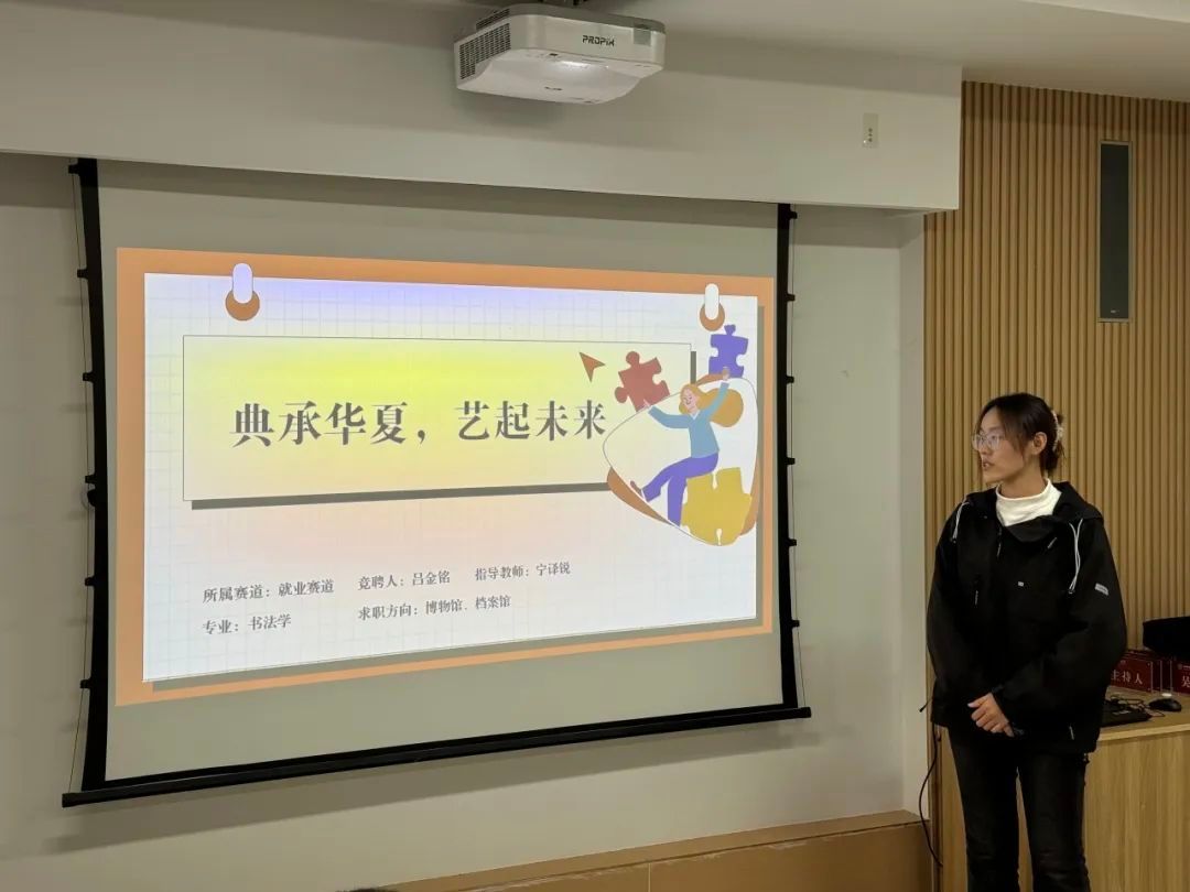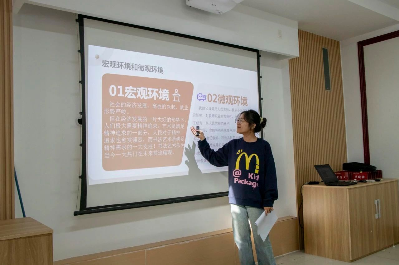比赛现场,成长赛道和就业赛道的选手们依次登场,通过精美的 PPT 演示和生动的演讲,阐述了自己的职业规划和求职目标。他们深入剖析自身优势与不足,结合市场需求与行业趋势,制定了详细且具前瞻性的自我成长计划和职业发展路径。有的选手立志成为书法教育的传承者,通过结合现代教育技术与传统书法教学,让古老艺术在校园中焕新活力;有的选手则专注于书法创作领域,计划通过举办个人书法展、参与国内外艺术交流活动,提升个人艺术影响力,推动书法艺术走向国际舞台;有的选手时刻不忘军营从戎经历,希望通过自己的努力成为一名守护人民安全的人民警察。