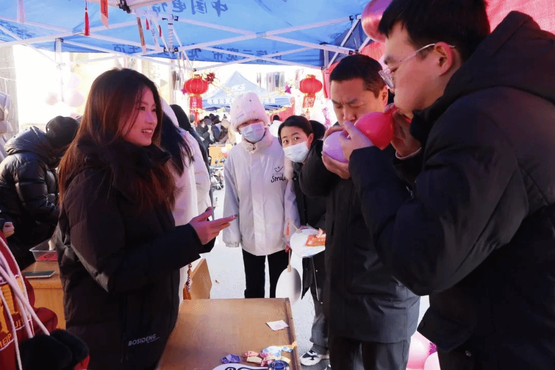 “吹牛皮大比拼”游戏更是妙趣横生。两名参赛者在15秒内同时吹起气球,看谁吹的气球更大。“砰”的一声,气球爆了。有的人吓得一哆嗦,有人忙捂耳朵惊呼,还有人在惊吓后放松大笑,现场气氛也随之热烈起来。