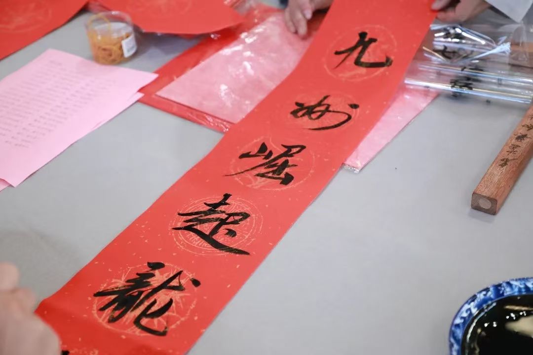 师生们挥毫泼墨,笔走龙蛇,楷书、行书、隶书等各类书体在他们的笔下尽显神韵。“龙腾四海雄风在,蛇舞九州瑞气生“福星高照平安宅,鸿运常临吉祥家”等一幅幅蕴含着浓浓祝福的书法对联跃然纸上,充分展示了书法艺术的独特魅力,引得在场员工们纷纷驻足欣赏,不少人还拿出手机拍照留念,记录下这些精彩瞬间。