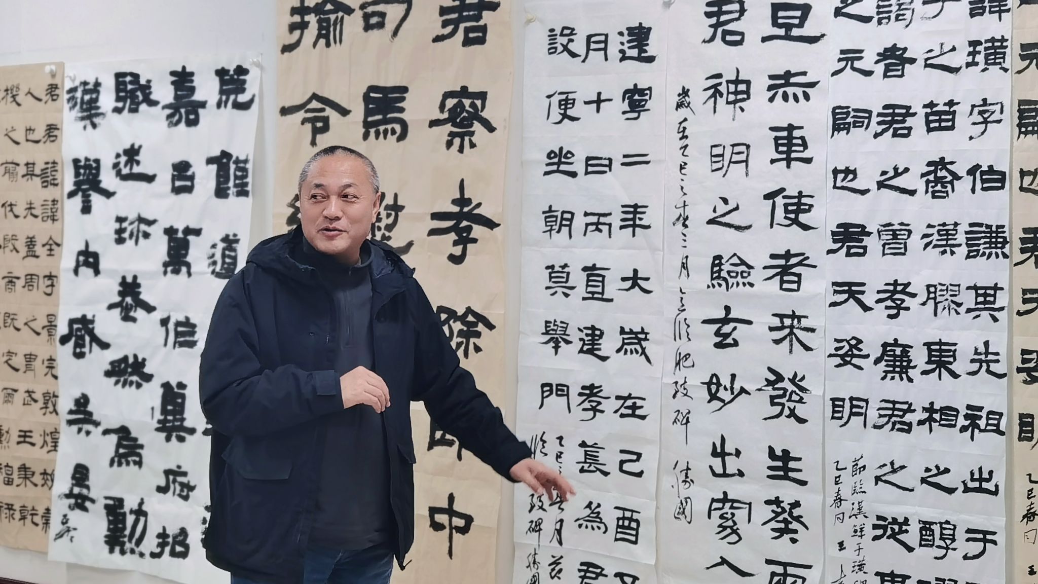 本次活动聚焦于汉代经典隶书碑刻。各位老师纷纷展示自己的作品,并结合书法实践和思考进行了深入解读。阴胜国老师分享了对《肥致碑》的独特见解,将其与其他汉碑隶书进行对比,着重探讨了该碑浑厚中蕴含的古拙意趣。王文清老师则选取《张迁碑》为例,分析了汉隶在书法作品气象、格局中的重要性,认为其地位不亚于金文。杨二斌副院长提出,可以借鉴清人作品,尝试反向思考,以寻求新的创作灵感。曹亚彬院长通过对比两张《鲜于璜碑》作品,深入阐述了笔法、章法、墨法等方面的理解和作品所表现的思想。丁俊瑞老师强调了“演绎”经典的重要性,认为实临是基础,而“演绎”则需保留临摹对象的原本面貌。王建魁老师不仅对自己的作品进行了解读,还从书法要素、作品气息、神采等角度对汉隶庙堂碑刻进行了深入剖析。