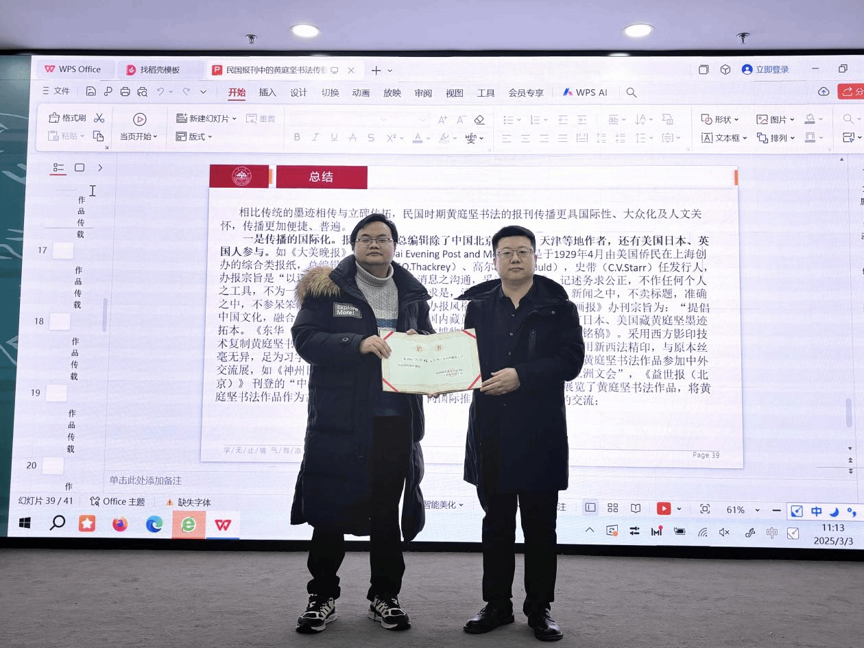 许永福教授的报告围绕“黄庭坚书法作品的刊登与传播、书论及评黄庭坚书的传载、书法展览的刊登传播”三个方面展开。在民国报刊中有许多其书法墨迹拓本信息,其中,既刊登过黄庭坚石刻真迹,也有伪迹出现,学界通过对其书法真伪、系年及书写内容进行了考订。在书论与评论方面,收录黄庭坚书论与相关评论的期刊丰富多样,其书论部分成为“热点”被反复转载。此外,民国报刊对黄庭坚书法展览的刊登,加强了中外艺术交流。此次讲座为研究黄庭坚书法在民国时期的传播提供了新视角,对书法史研究和传统文化传承具有重要意义。