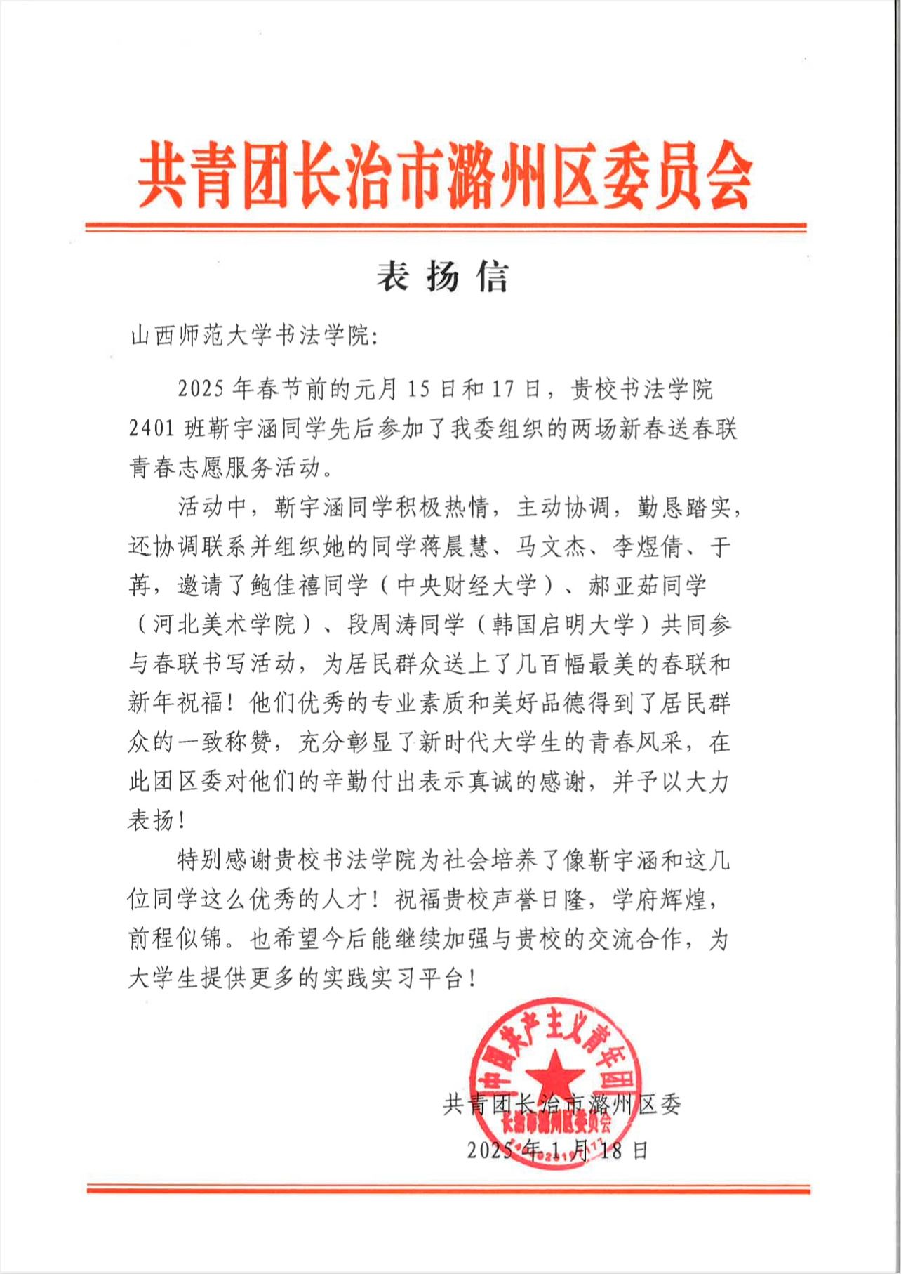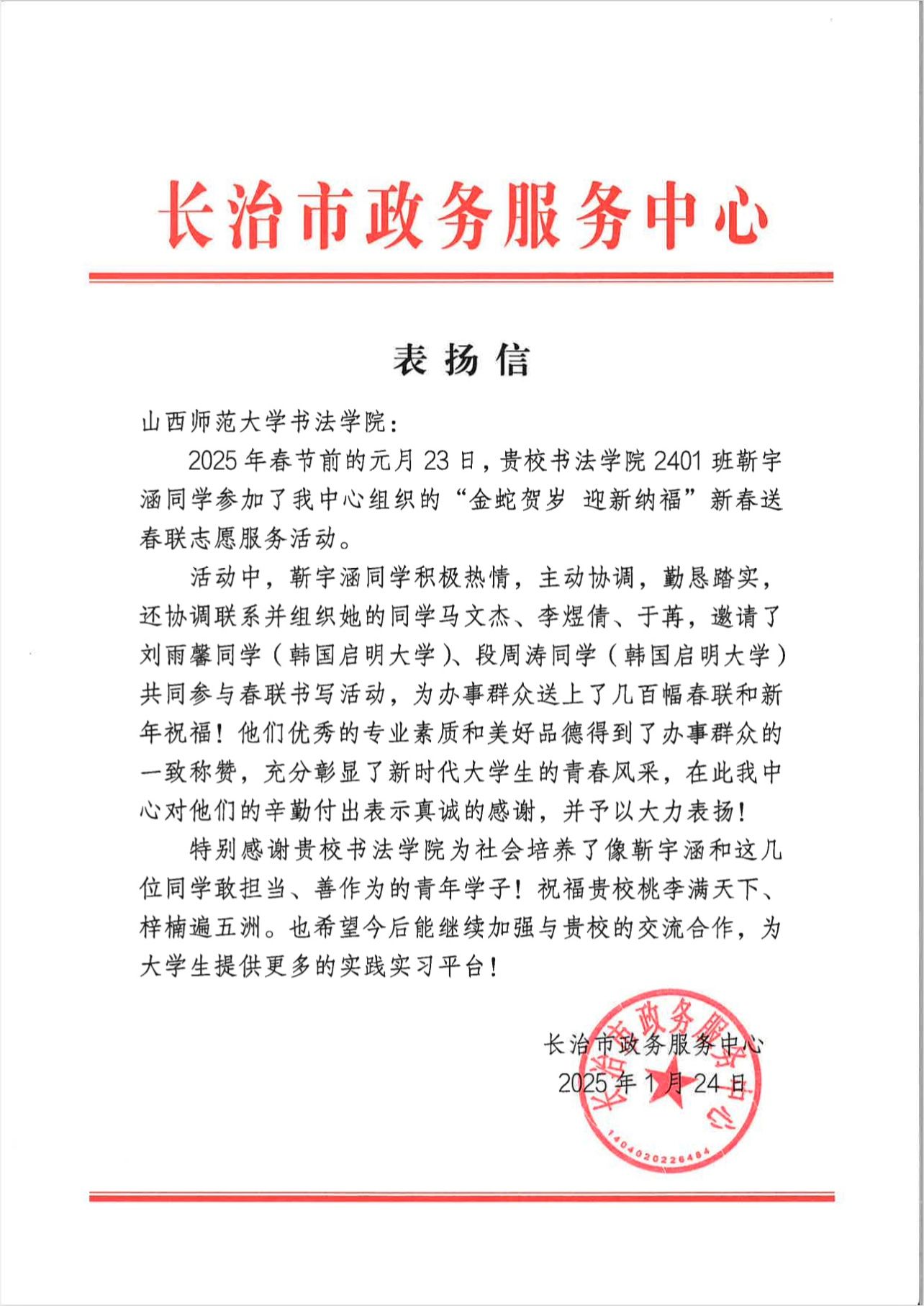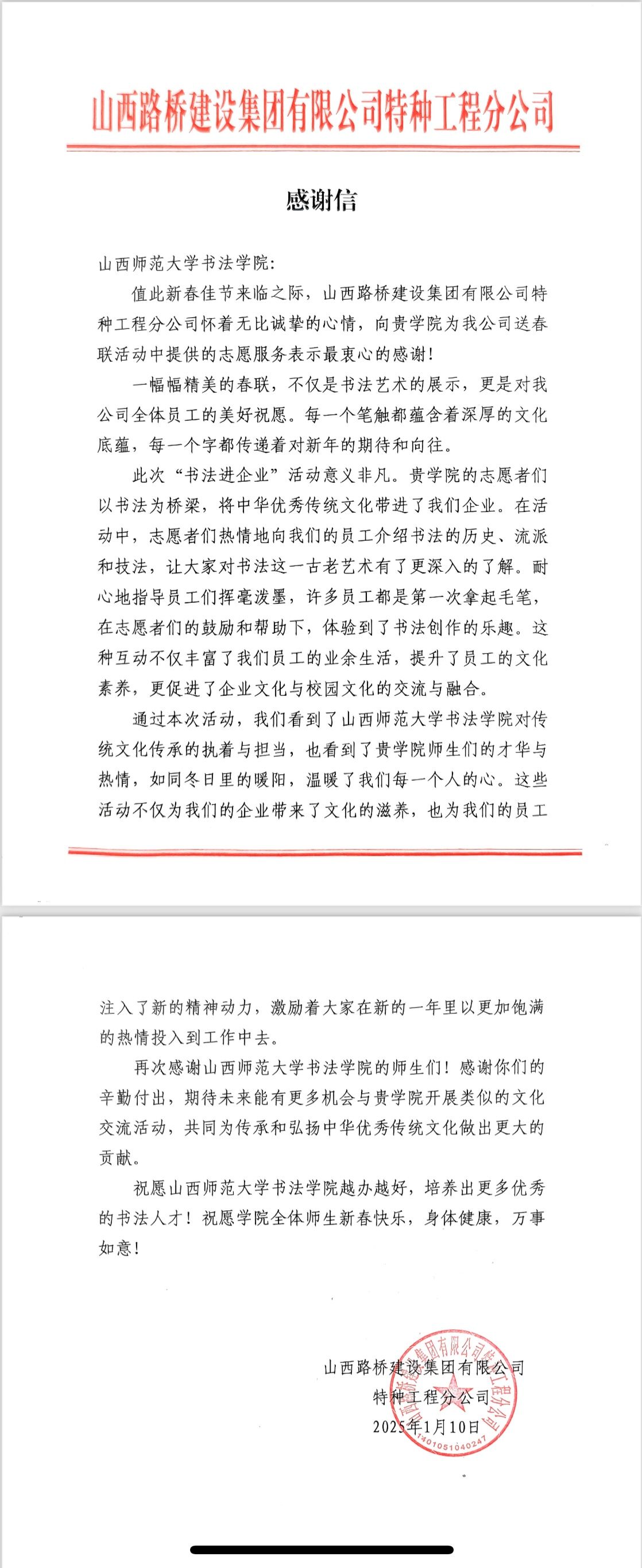 收到了来自长治市政务服务中心、共青团长治市潞州区委、山西路桥建设集团有限公司特种工程分公司的感谢信。他们对我院的人才培养质量与师生传承弘扬中华优秀传统文化的担当给予了高度认可与赞扬,并希望今后在传承弘扬中华优秀传统文化方面开展更多合作。