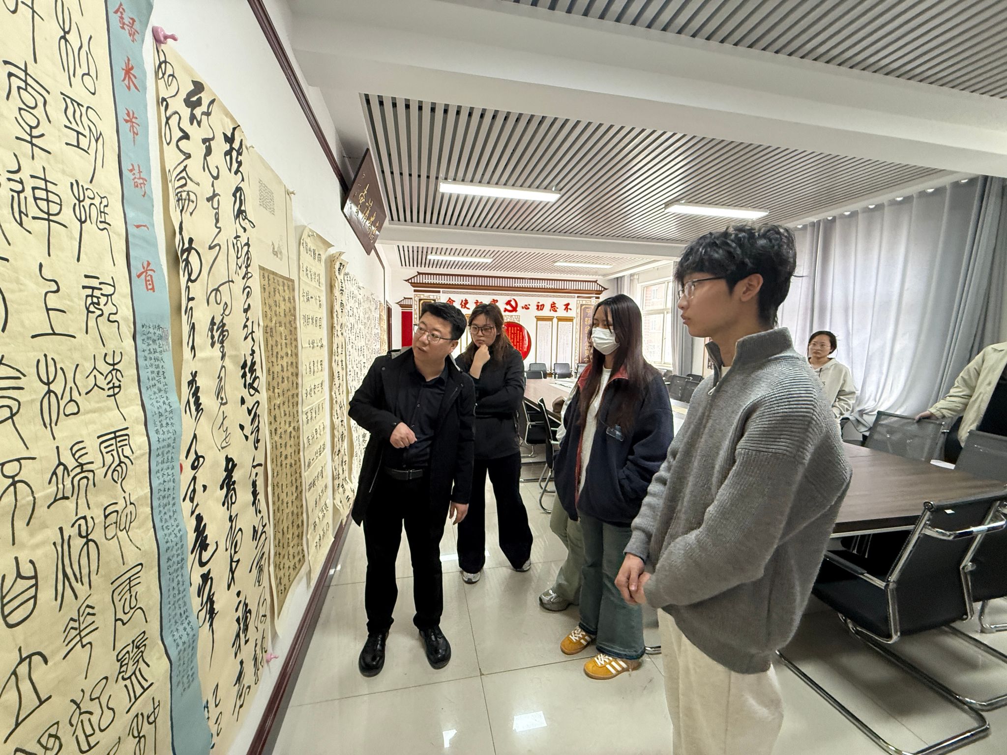 随后,21级同学们展示了他们的毕业创作作品,这些作品凝聚了他们大学几年的艺术心血。曹老师针对这些作品进行了更加深入细致的点评,结合每位同学的创作理念和风格特点,从选题立意的深度、表现手法的多样性、作品的创新性以及文化内涵的传达等方面进行了全面深刻的剖析。23级同学们也认真聆听,虽然他们尚未面临毕业创作,但从师兄师姐的作品和老师的点评中汲取了宝贵的经验,对书法创作有了更深的理解,也为自己的创作之路开拓了新的思路。