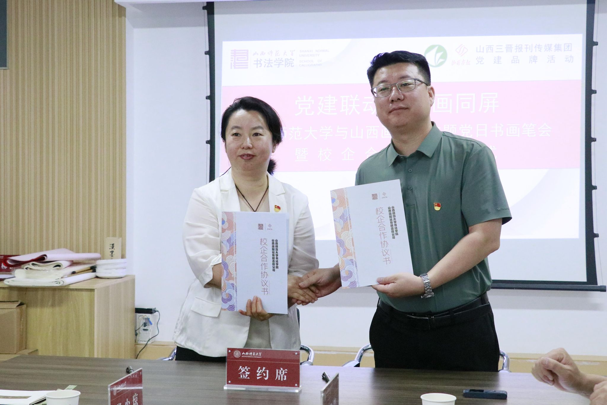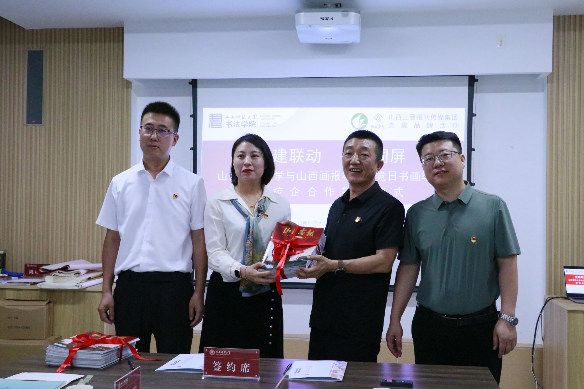 与山西画报社“党建联动 书画同屏”主题党日书画笔会暨校企合作签约仪式在8号教学楼301会议室举行。