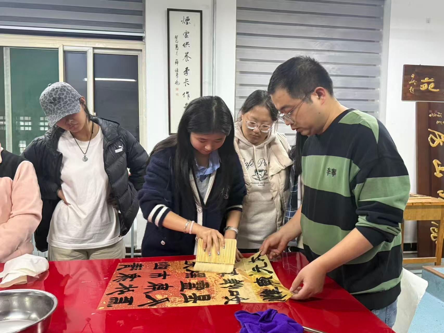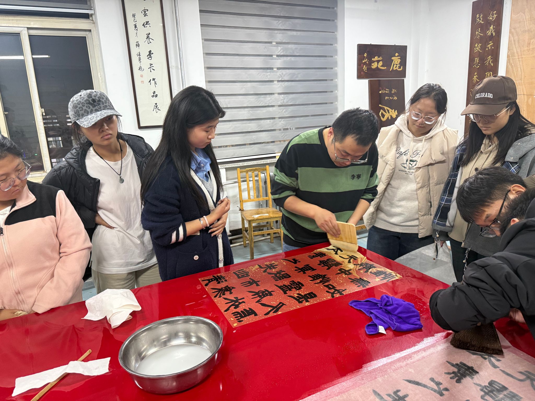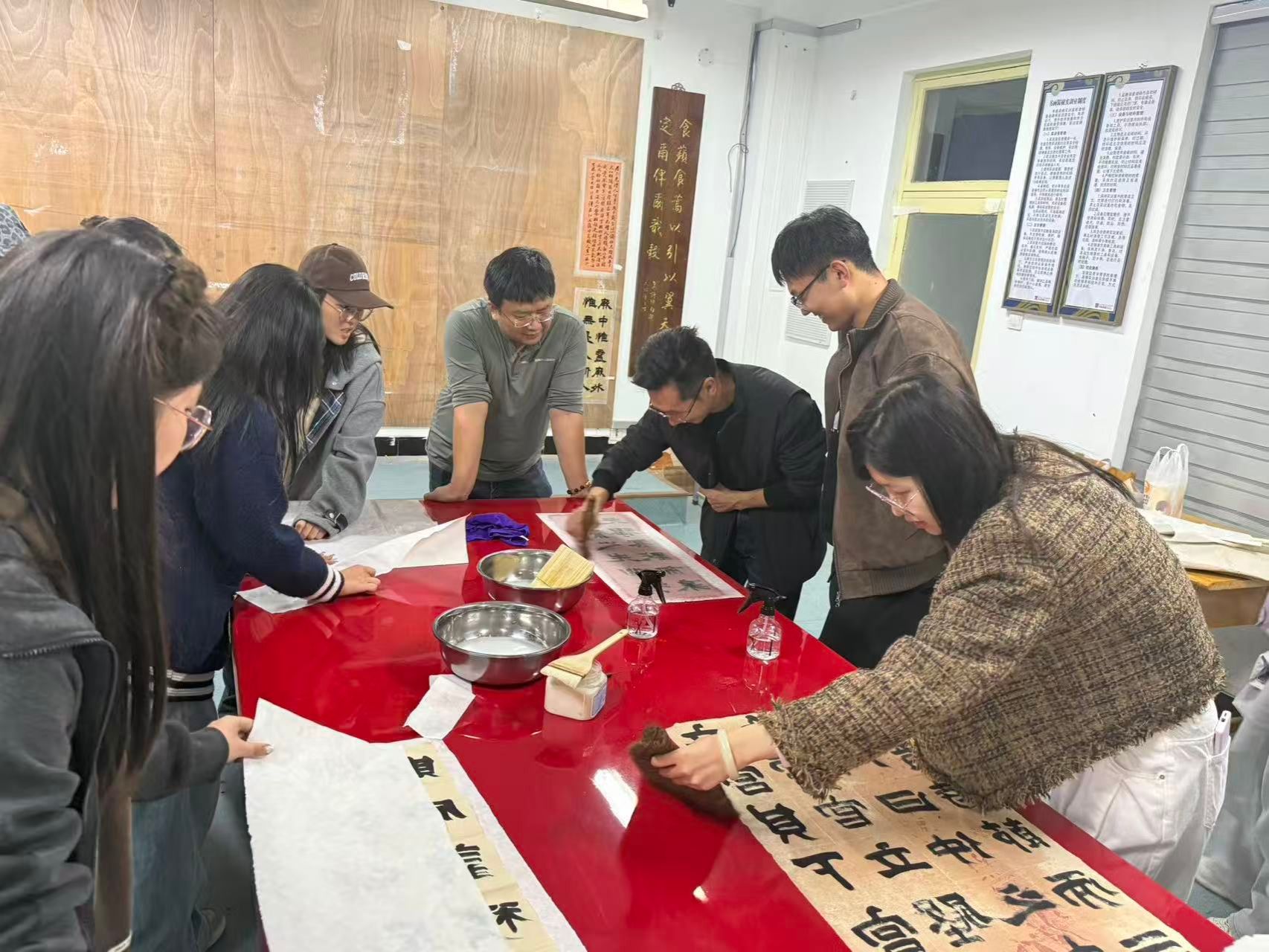 学生精心呈现了一堂生动且极具实践价值的传统书画装裱教学实践课。王文清、程龙两位老师以及20余名学生参加了此次活动。