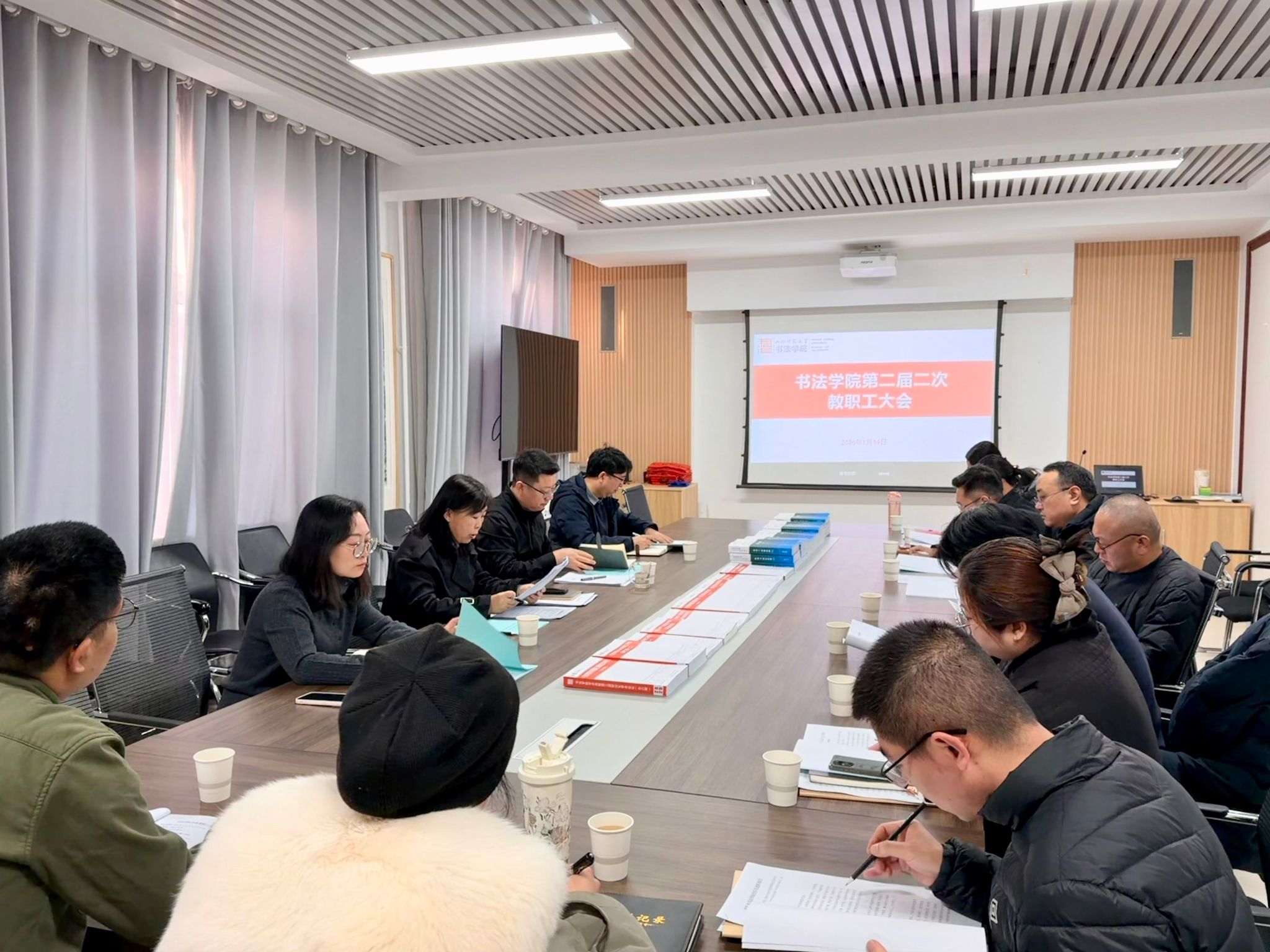 学院院长曹亚彬作了院长工作报告。报告思路清晰、目标明确、举措务实,为学院发展凝聚了共识,激发了教职工的奋斗热情。报告全面系统地回顾和总结了2025年学院在党建引领、学科建设、人才培养、科学研究、社会服务等方面取得的主要成绩,客观分析了当前学院发展面临的机遇与挑战,并对下一阶段的重点工作和“十五五”规划的初步思路进行了详细部署。他指出,要围绕政治建设、师范建设、学科建设、文化建设、数字建设等重点任务,以“十五五”规划、高层次人才、“人才智能+”等“三件大事”牵引全年工作,全力推进学院各项改革深入开展。一要聚力申博攻坚,强化学科建设。对照申博指标,引进高层次人才,建强“侯马盟书”科研团队,培育“三晋古文字”科研团队,开展有组织科研,发挥科研反哺人才培养作用。二要深耕师范特色,强化专业建设。组建教学团队,开展有组织教学,打造示范“金课”;做好书法学专业认证整改,建强书画文物保护与修复专业。三要巩固学术优势,丰富多元合作模式。系统构建“理论+实践”“传统技艺+现代科技”融合体系,深化产、学、教、研协同机制,提升学术话语权与行业影响力。