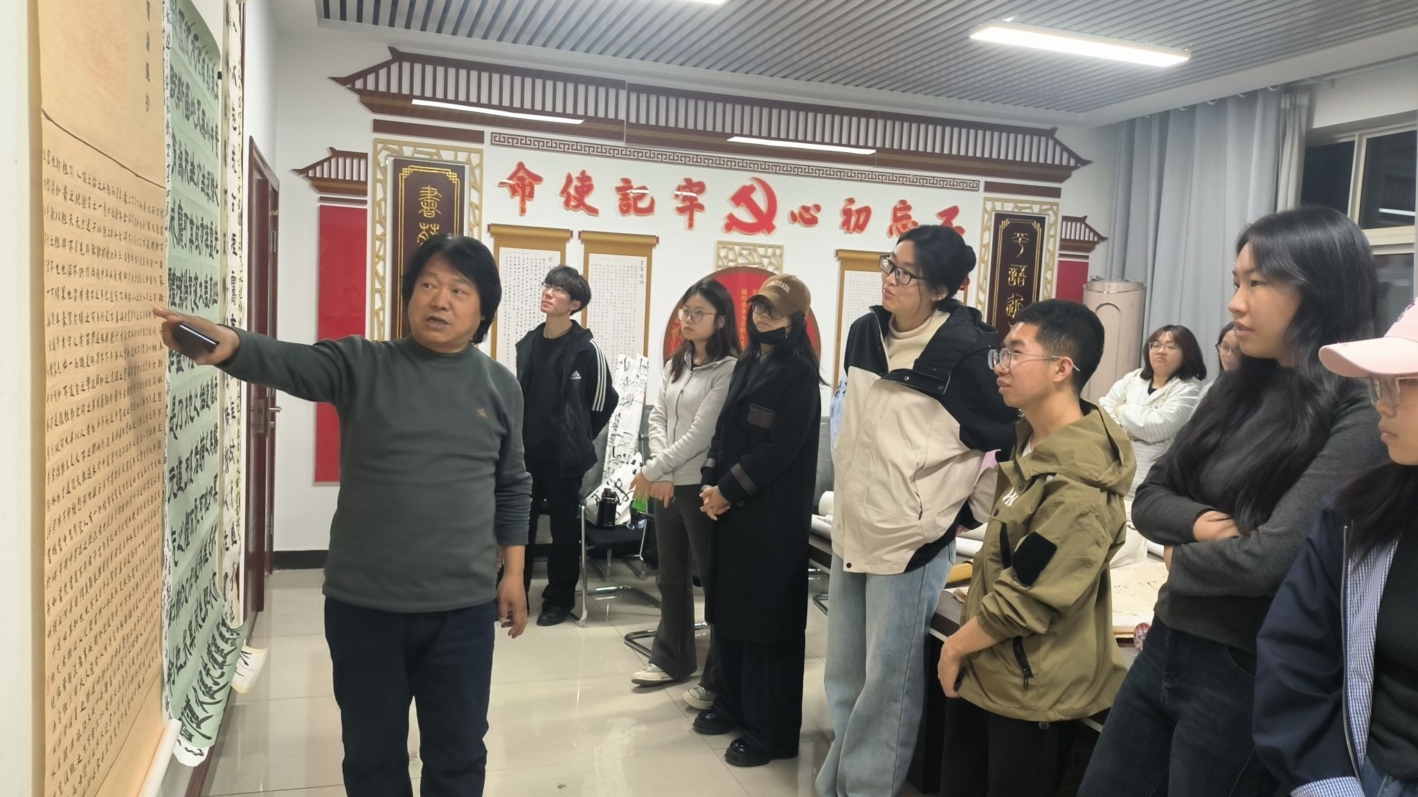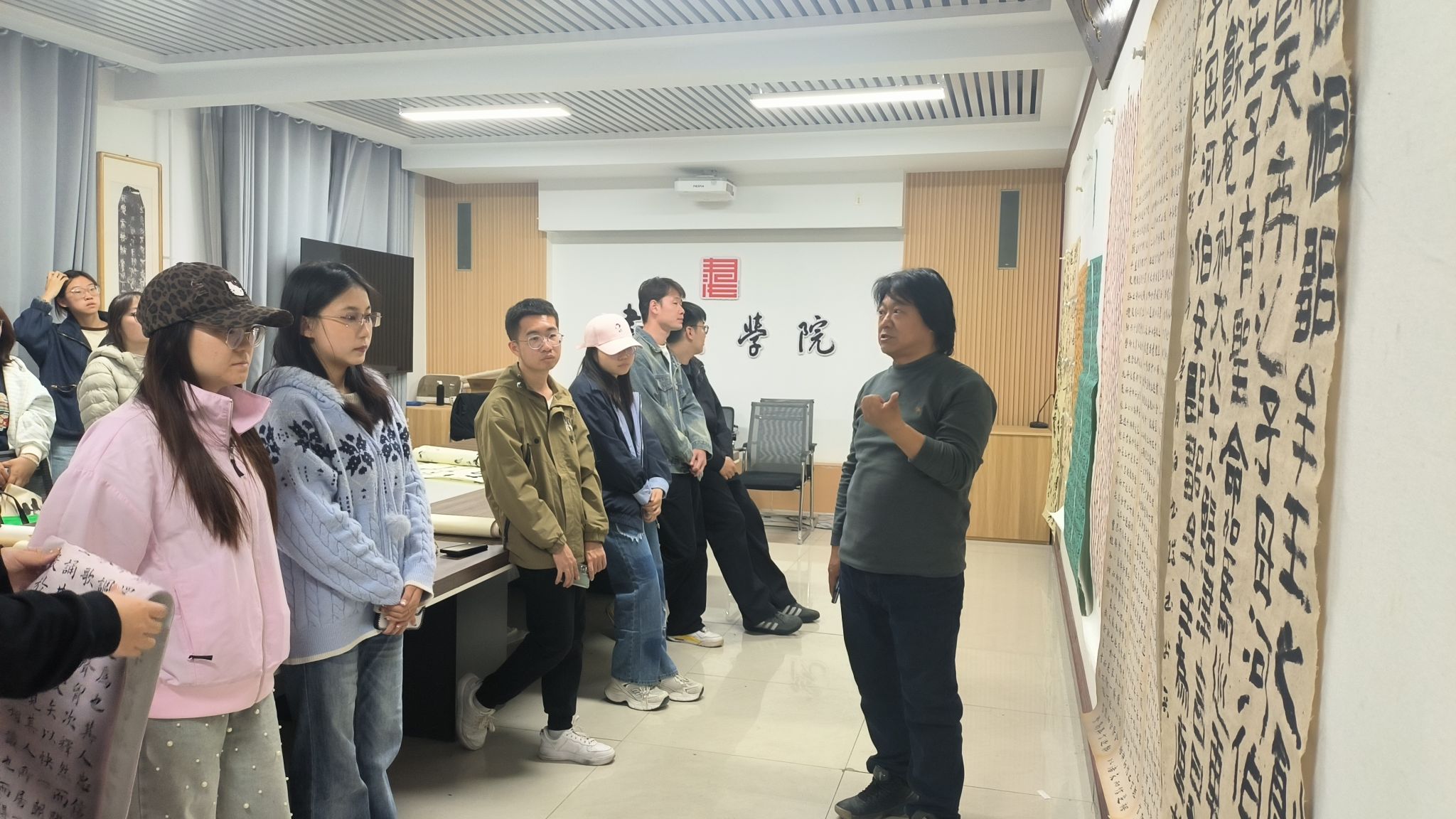 活动围绕两大核心环节展开:导师逐一对大四同学的毕业作品(临摹与创作)从章法、笔墨、风格等维度进行精准点评,同时针对毕业论文选题、框架、内容等关键问题答疑解惑,为毕业答辩筑牢基础;随后全面点评大二同学书法作品集,梳理共性问题,从形式搭配、草书创作、风格统一、落款规范、用墨技法、汉字书写等方面给出专业解决方案,并系统提升同学们的创作审美。