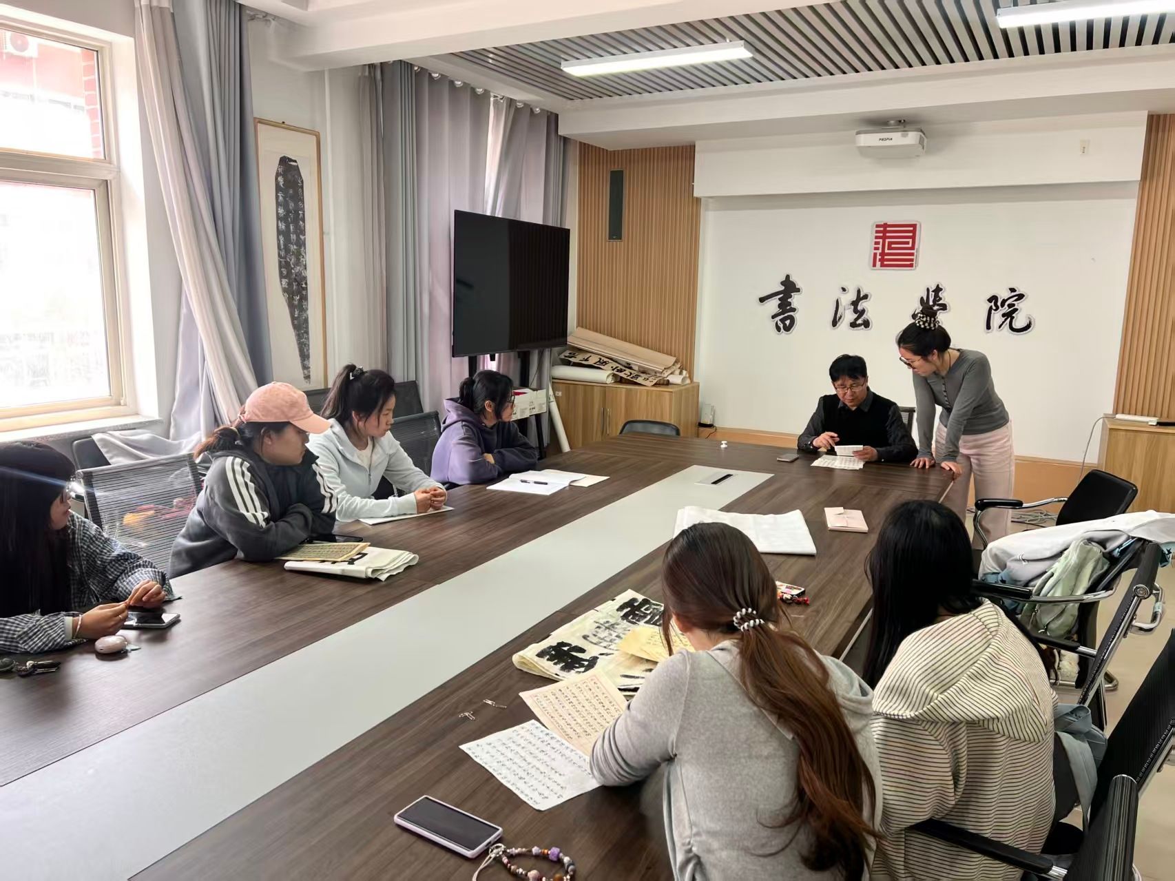 2026年4月13日中午,蜜桃堂 杨二斌导师工作室在学校南区八号教学楼8301会议室召开了本学期第二次书法交流活动,就日课作业和学生作品进行逐一点评并提出修改建议。
