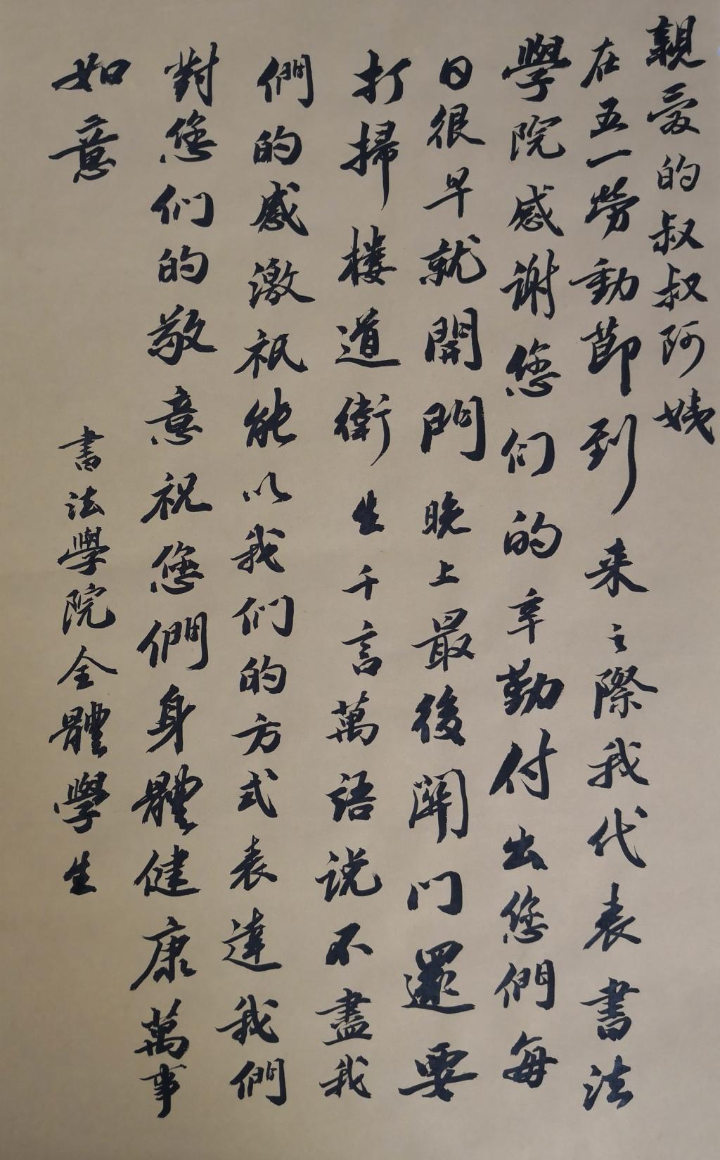 活动过程中,1701团支部全体成员积极参与,以小组形式分别到各宿舍楼管处,为宿舍管理员们送去了节日祝福和亲笔书写的感谢信,并与宿管叔叔阿姨们亲密地交流了平时的工作与生活。