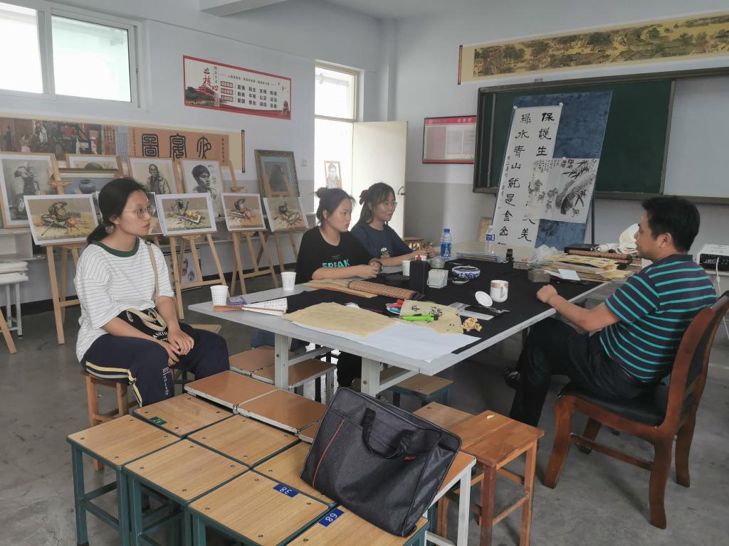 到达晋城市沁水二中后,队员们在学校美术老师的带领下参观了学校的美术教室及美术展览,并通过与老师沟通交流,对当前沁水二中美术和书法课堂发展的现状和学生的书法学习情况有了初步的了解。随后队员们深入到五个学生教室,进一步调查了解学生们学习书法的状况和他们对书法的认识。在调查交流过程中,队员们向学生们讲解了习近平总书记对于保护和弘扬中华传统文化的重视,并说明了学习书法对他们日后学习和生活的重要性,进一步增强了学生们保护和弘扬中华传统文化的意识,激发了他们学习书法的兴趣。