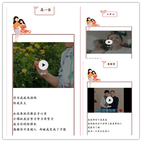 在活动作品中,学生们运用新媒体技术将妈妈陪伴自己长大的过程和自己想对妈妈说的话编辑成形式多样、活泼有趣的短视频,感情真挚。短视频在学院微信公众平台播出后,受到大家的认可和欢迎。