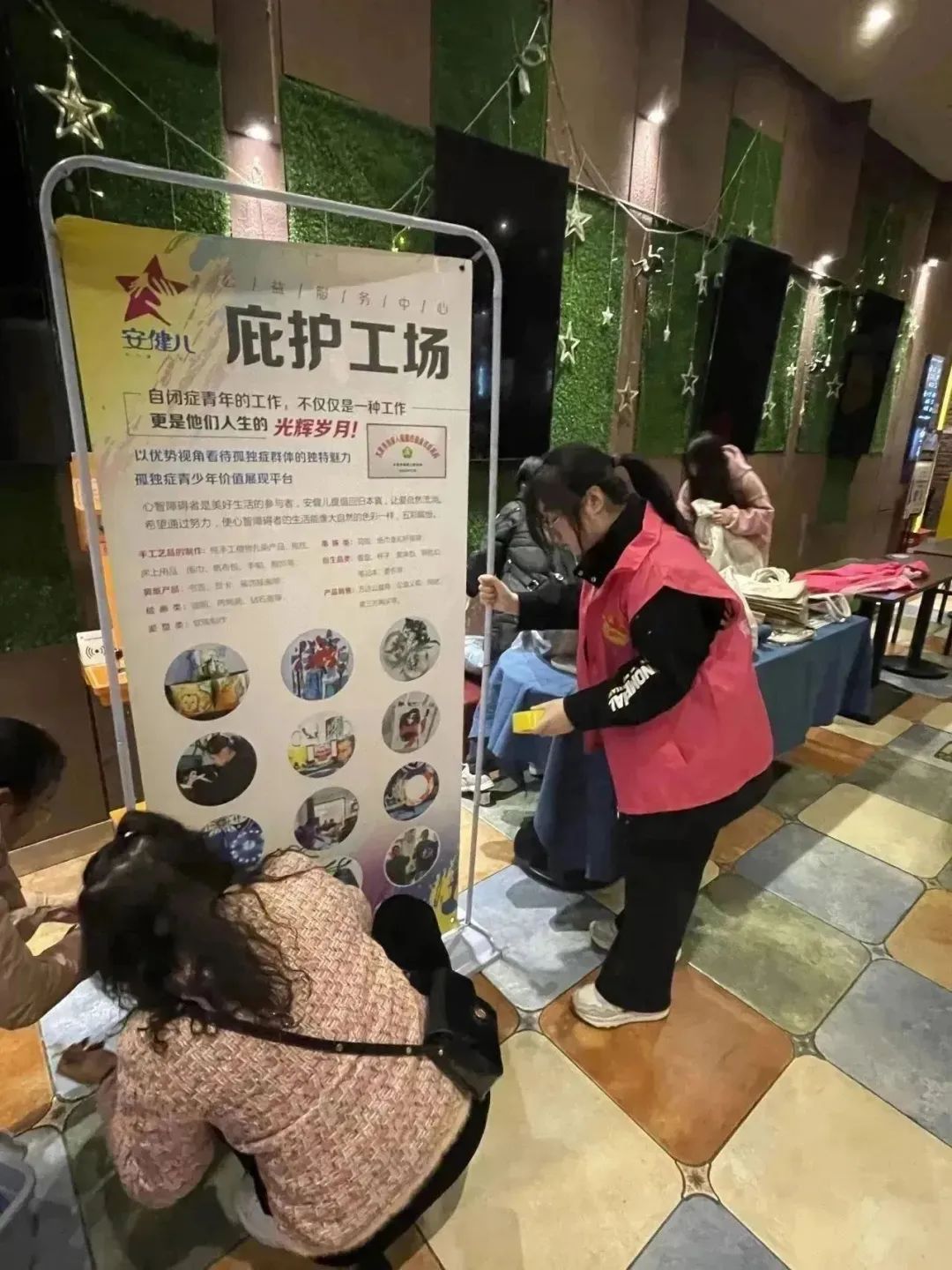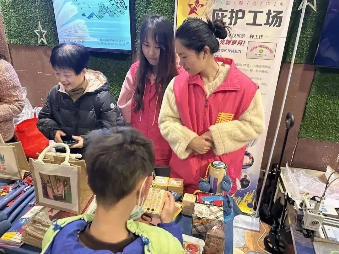 活动期间,志愿者们帮助安健儿公益服务中心的孩子们向爱心人士们仔细介绍孩子们亲手做的扎染丝巾、香包、笔记本、冰箱贴等手工艺品,摊位前人流络绎不绝,大家纷纷用自己的实际行动支持公益事业。看着摊位上的物品不断变少,孩子们的脸上露出了开心的笑容。