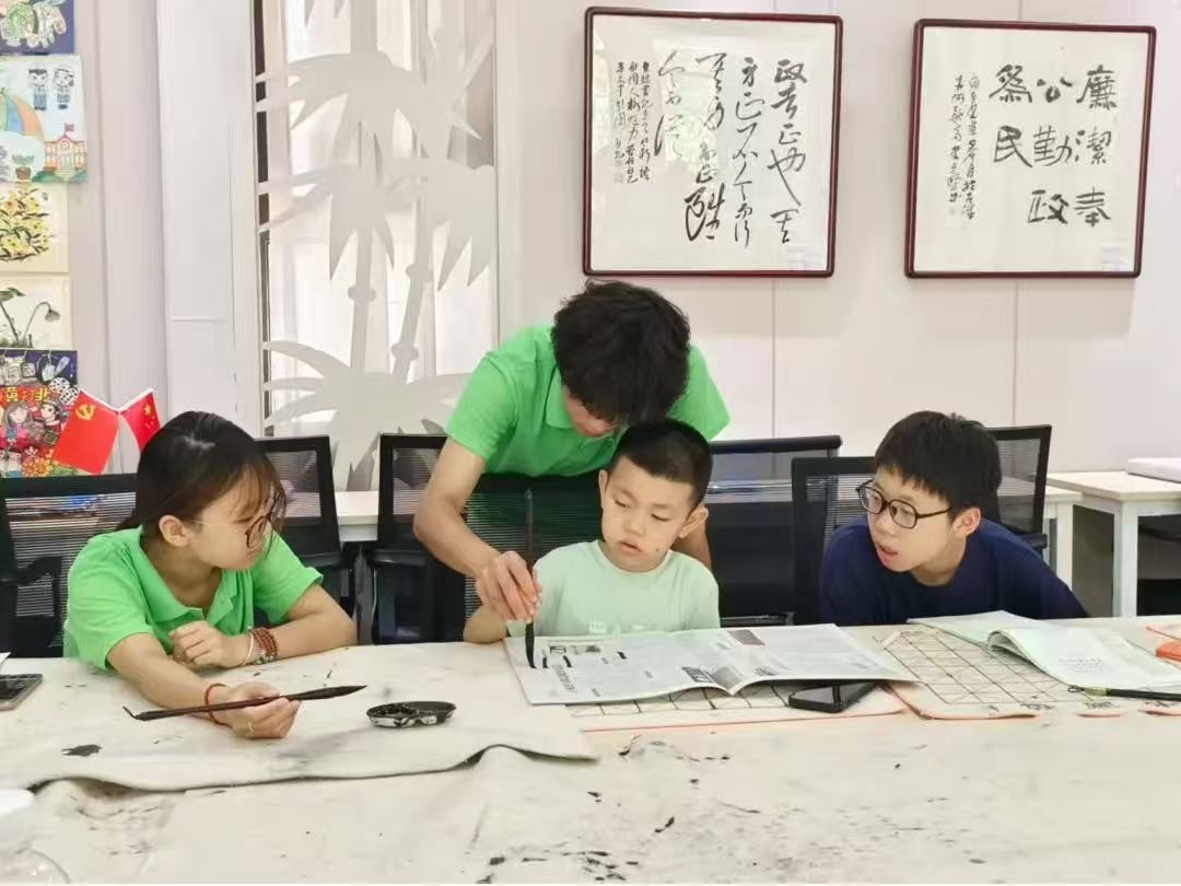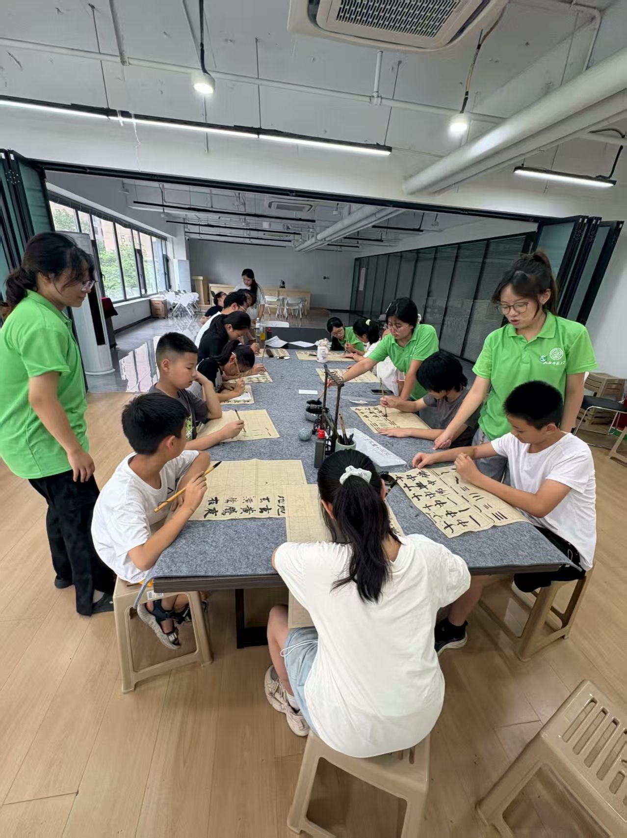 在社会实践活动中,队员们根据不同年龄段儿童的认知特点制定硬软笔教学计划,通过临摹范例、趣味练字游戏帮助孩子们规范书写,引导孩子们在提按顿挫中感受书法之美。除书法义务教学和课业辅导外,队员们还通过素质拓展活动、集体心理辅导游戏等与孩子们亲切互动,营造出轻松愉悦的活动氛围。