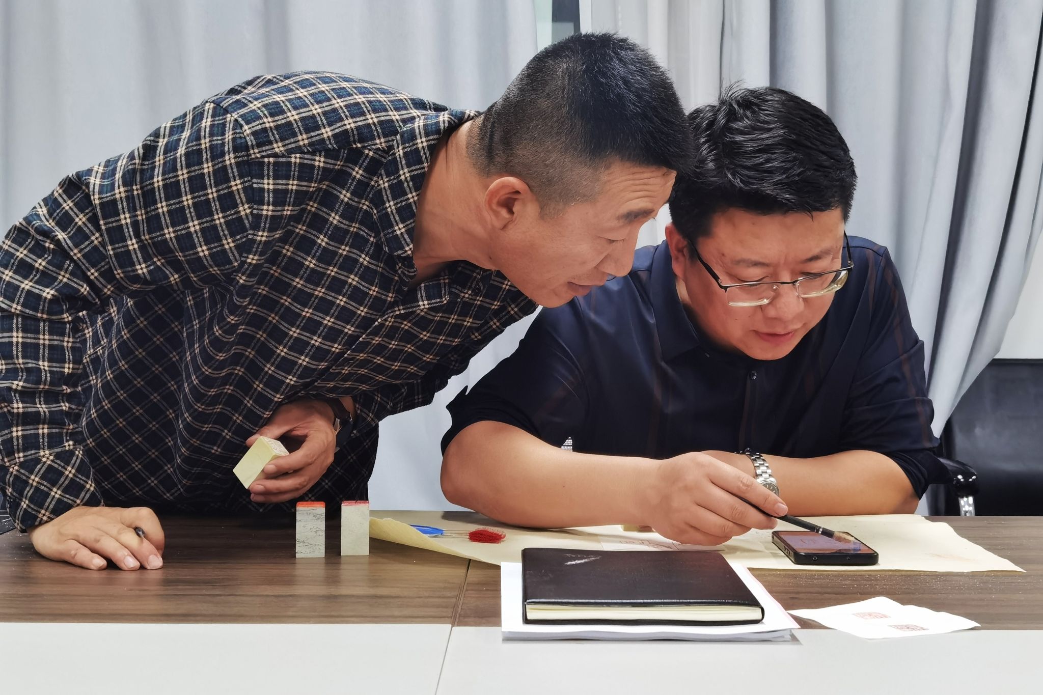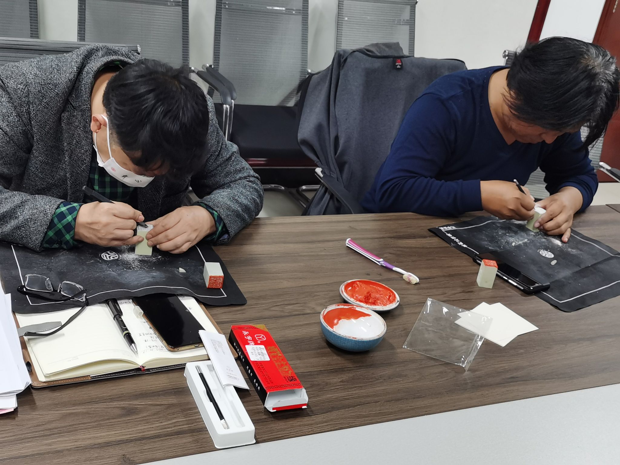 在活动开始后,王建魁老师从印石之美、印钮之美、边款之美和印章之美,引导教师学习相关知识,激发老师们的学习热情。随后,蜜桃堂 办公室主任、展览部主任王文清老师重点对朱文印的发展历史、流派、刀法、印稿设计、边款制作等作了全面的讲解,尤其在篆刻刀法、印稿设计、印章临摹、印章创作四个方面与教师们面对面互动交流。最后,各位老师现场进行了印章的摹刻,相互观摩了不同的临摹方法和刊刻技巧。