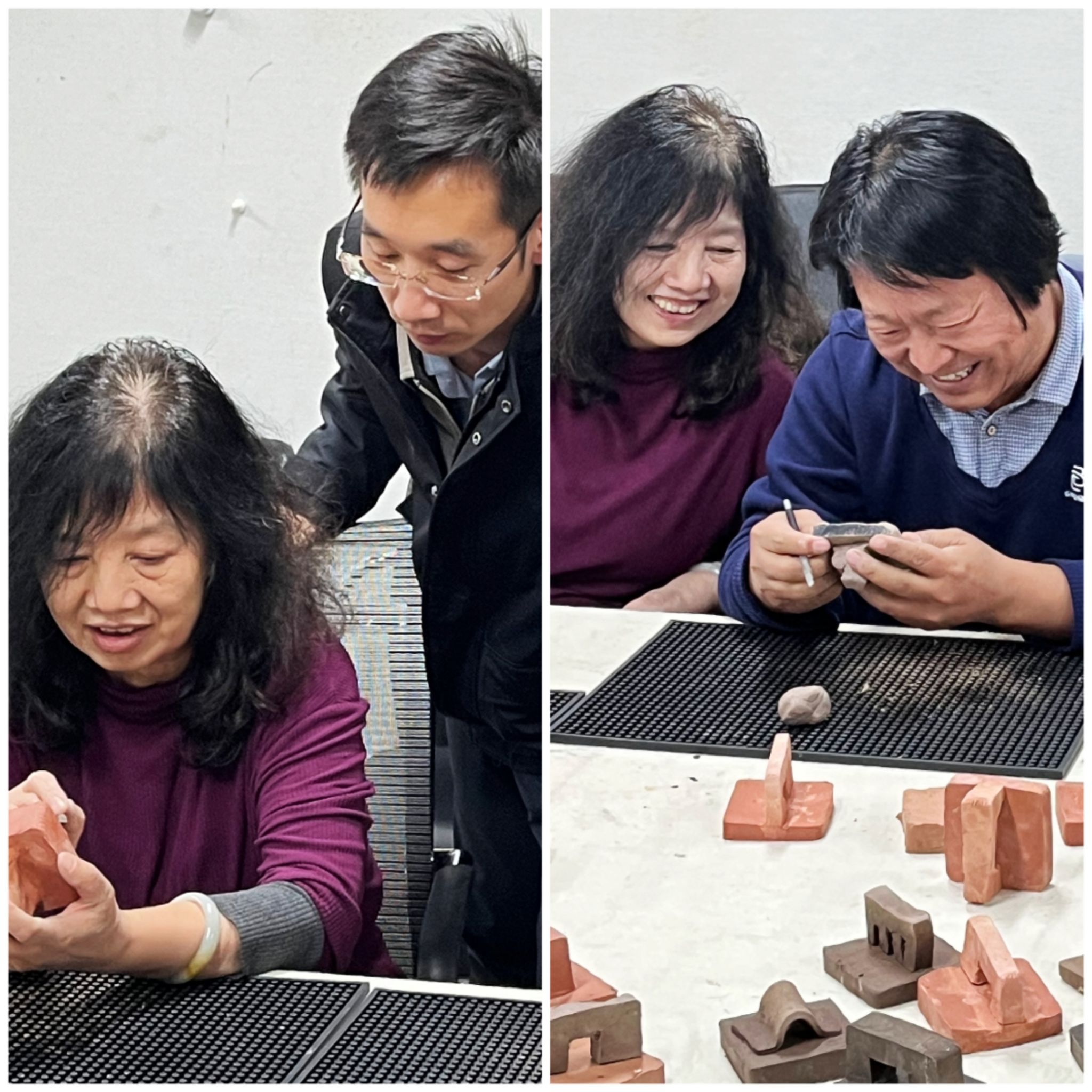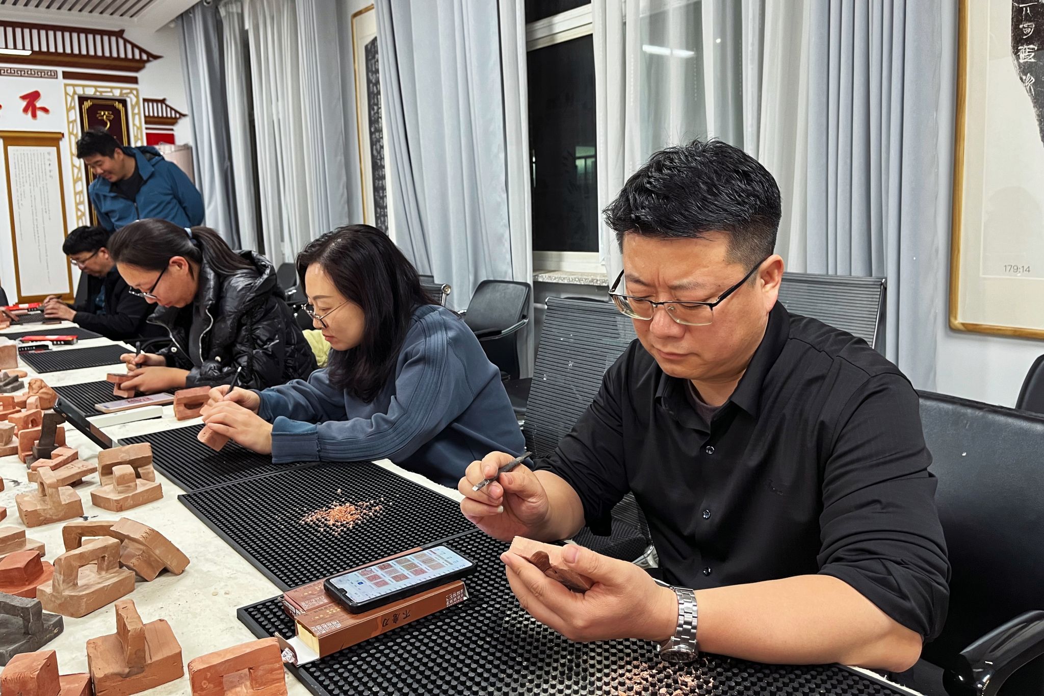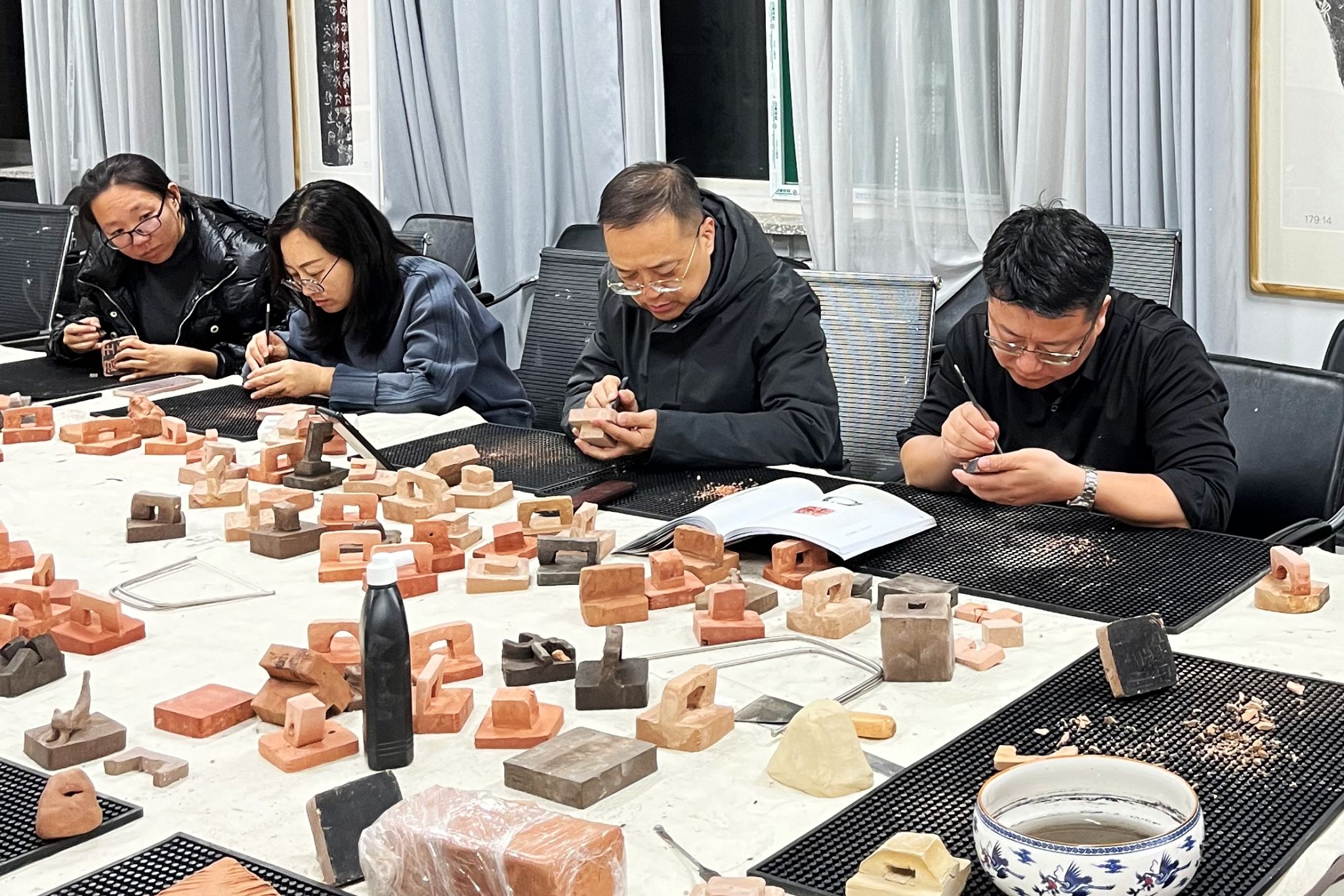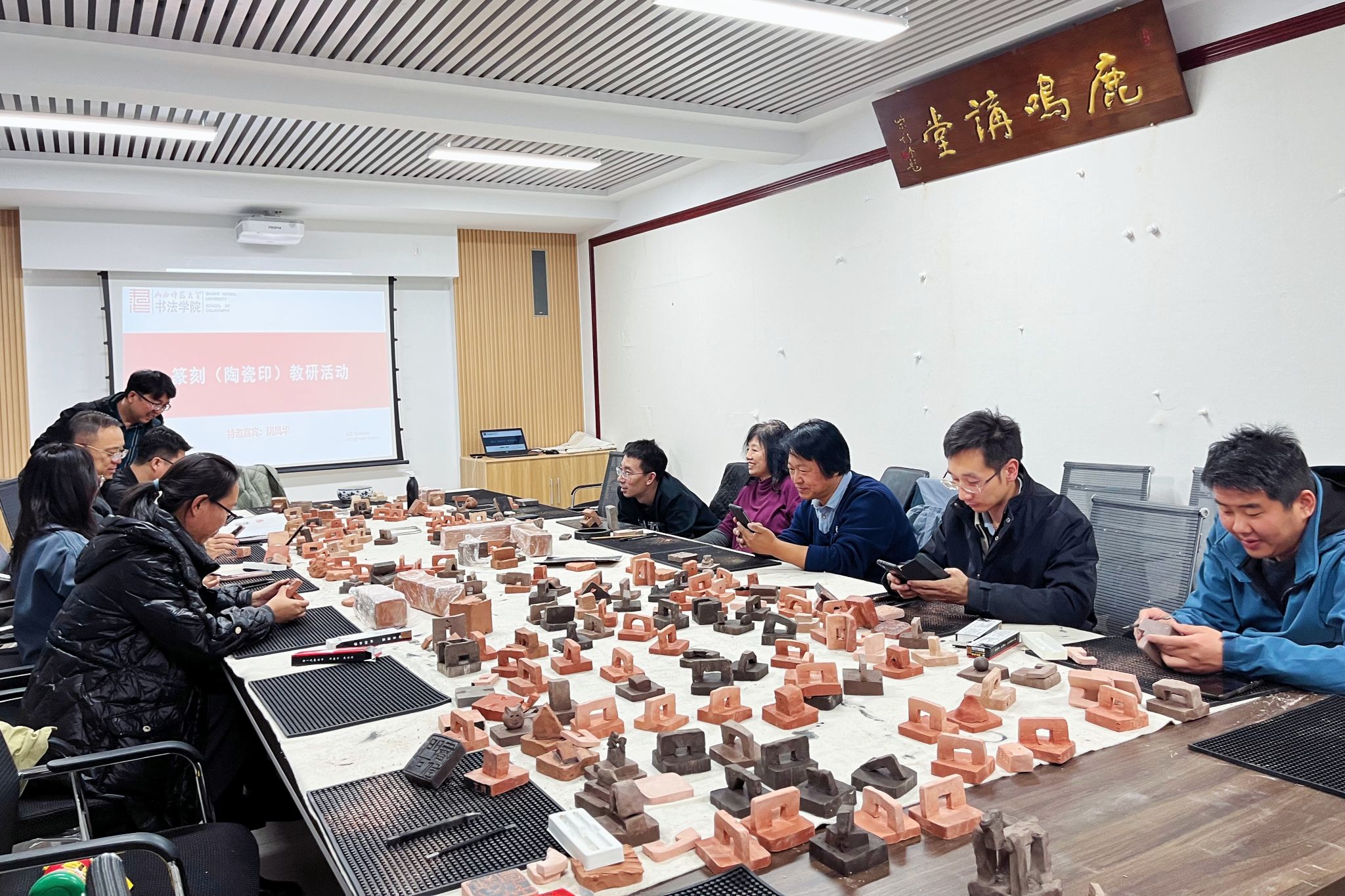 技法教研室主任王建魁邀请阴凤华老师对陶瓷印的相关知识进行讲解。阴老师结合自己制作的“由土而生”、“窑火唤彩”、“瓷光初现”、“和敬清寂”、“水墨青花”等系列作品,全面讲解了陶瓷印的发展历史、制印技巧、刊刻流程、烧制工艺等知识。讲解结束后,阴老师现场进行了示范,展示了刊刻技巧、说明了设计理念。随后,老师们在拿到事先素烧过的瓷印泥块后,先进行印纽的设计雕刻及印面打磨,之后根据所刻文字内容,进行或阴或阳的刻制,阴老师全程进行了辅导。