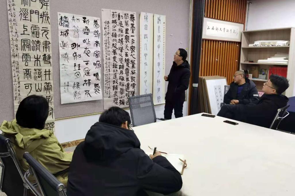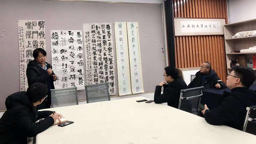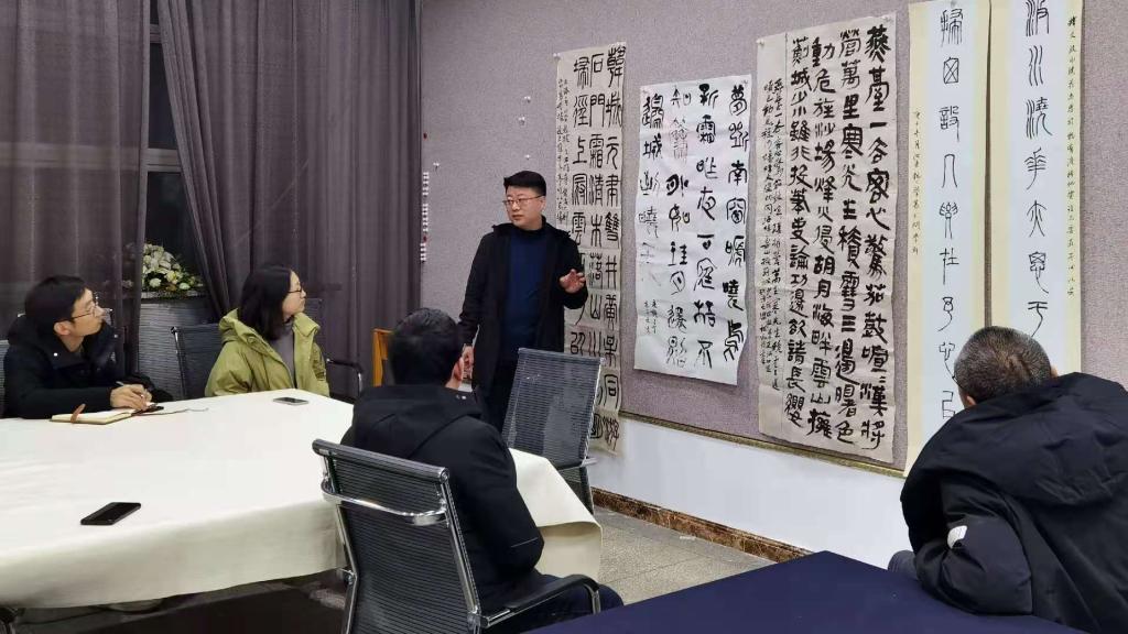 12月17日晚,我院技法教研室专业教师第六次“重温经典”书法艺术交流活动在10505技法教研室举行。活动由技法教研室主任王建魁老师主持,曹亚彬、杨二斌、黄玉岩、丁俊瑞、王文清5位老师参加了本次艺术交流活动。此次教研活动,大家对各自选定的篆书创作作品进行点评交流。最后,教研室主任王建魁对本次教研活动做出总结。