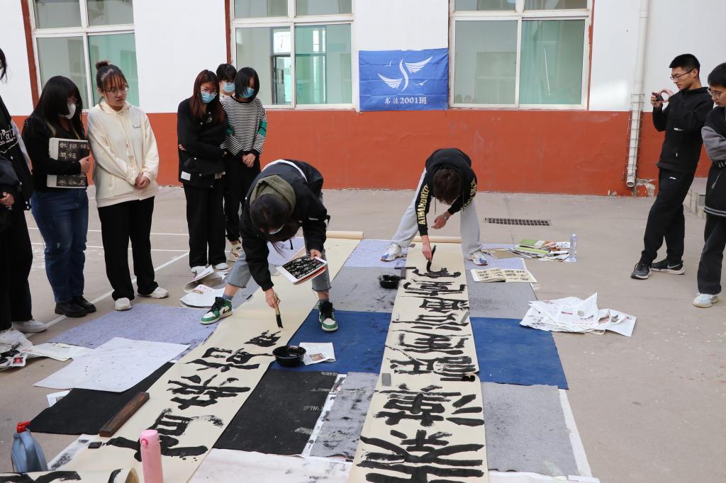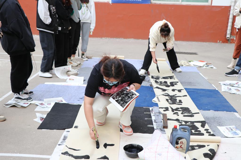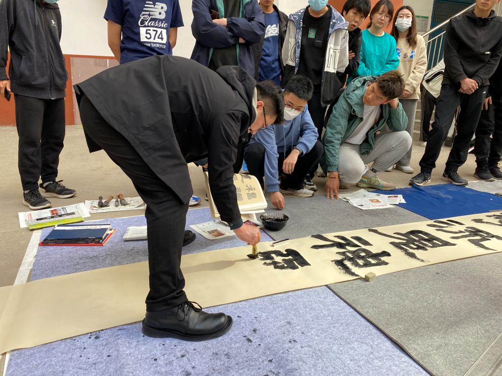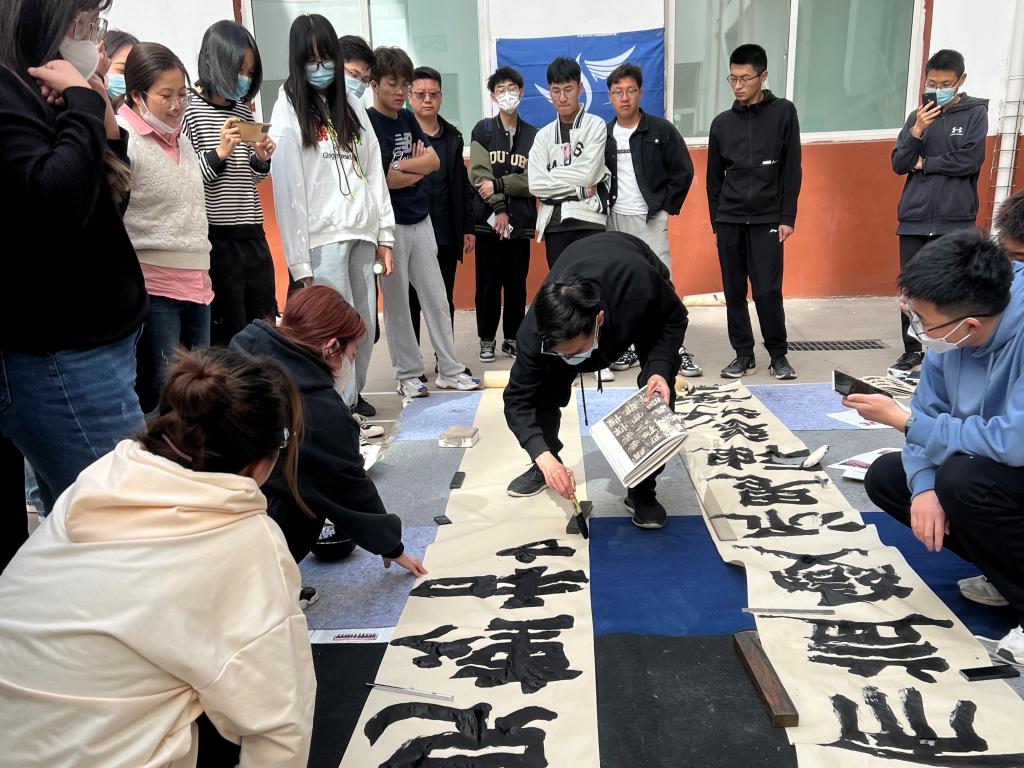 活动伊始,曹亚彬老师首先为大家讲解了室外书写大字与室内日常书写的区别,强调了书写大字时的运笔技巧。随后,曹亚彬和王文清两位老师为同学们进行了现场大字书写示范,整个过程收放自如、运笔厚重雄强,使大家对这个新的课堂教学方式产生了强烈的兴趣。示范结束后,在场的同学积极与老师交流自己对大字书写的看法和疑惑,并有序尝试了大字书写。在试写过程中,同学们丝毫没有胆怯,在短时间的适应后逐渐放开,用自己手中的笔感受着书写的乐趣。活动最后,两位老师和同学们合作写出了团结、创造、求实、奋进八字校训,为本次课堂教学画上了完美的句号。