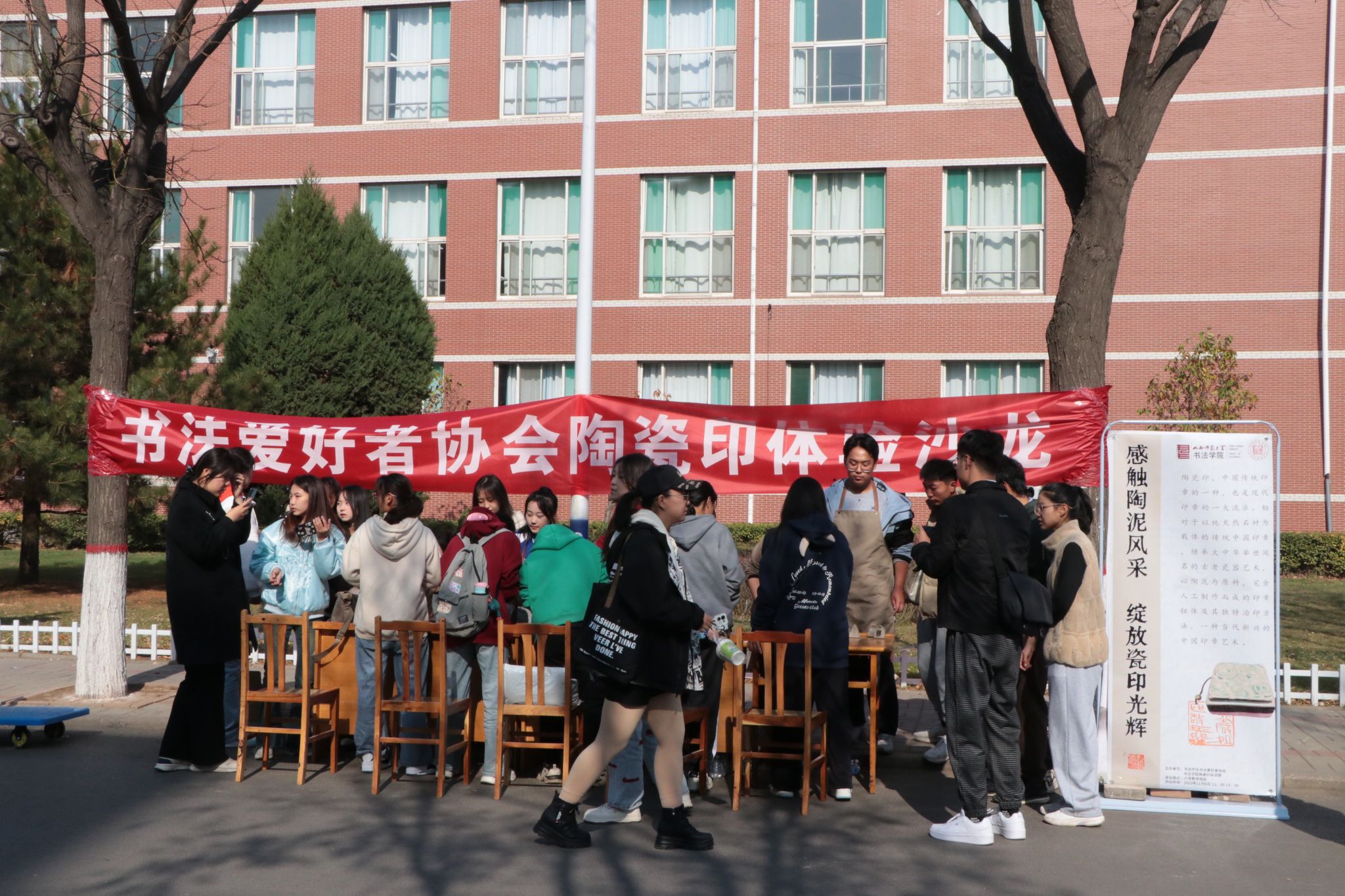 为弘扬陶瓷印艺术文化,提升学生艺术修养,11月8日,书法爱好者协会在六号教学楼前举办了陶瓷印体验沙龙。