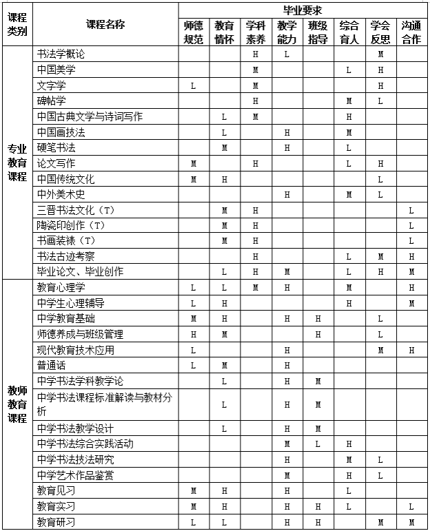 4.[教学能力]依据中学教师专业标准和中学教师教育课程标准,针对中学生身心发展规律和认知特点,具有初步运用中学书法学科教学知识和现代教育信息技术有效开展课堂教学设计、教学实施和教学评价活动的能力;通过学团、社团活动、教育见习、实习、研习等获得完整的综合性教学体验。具备书法教学基本技能,关注书法教学领域的热点问题和最新进展,具有一定的书法教学研究能力。