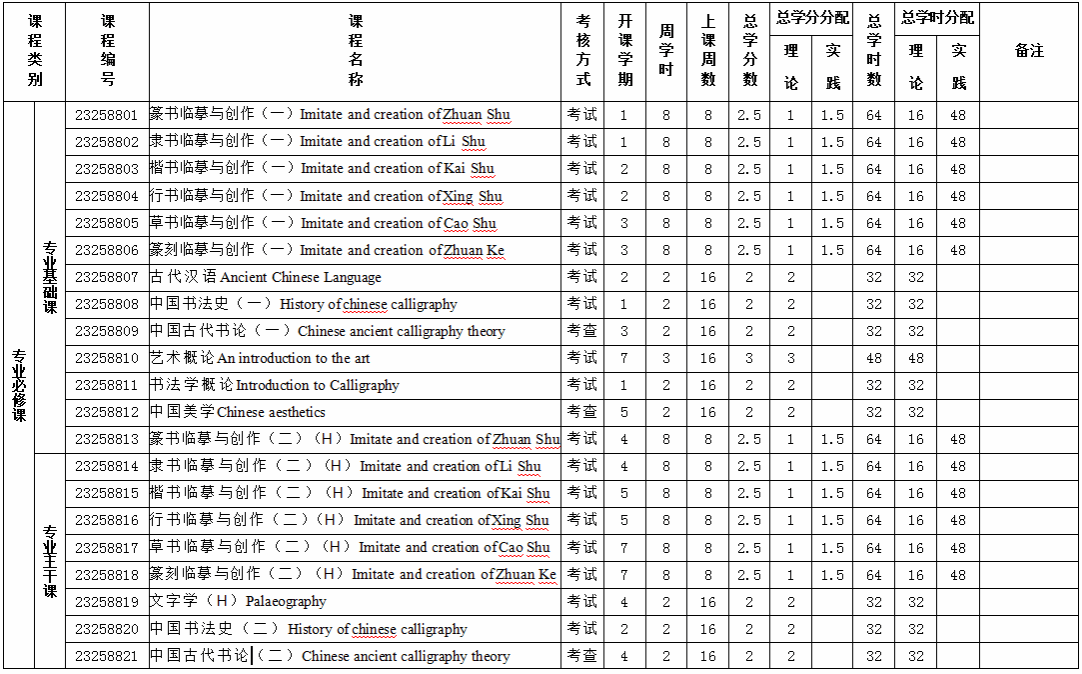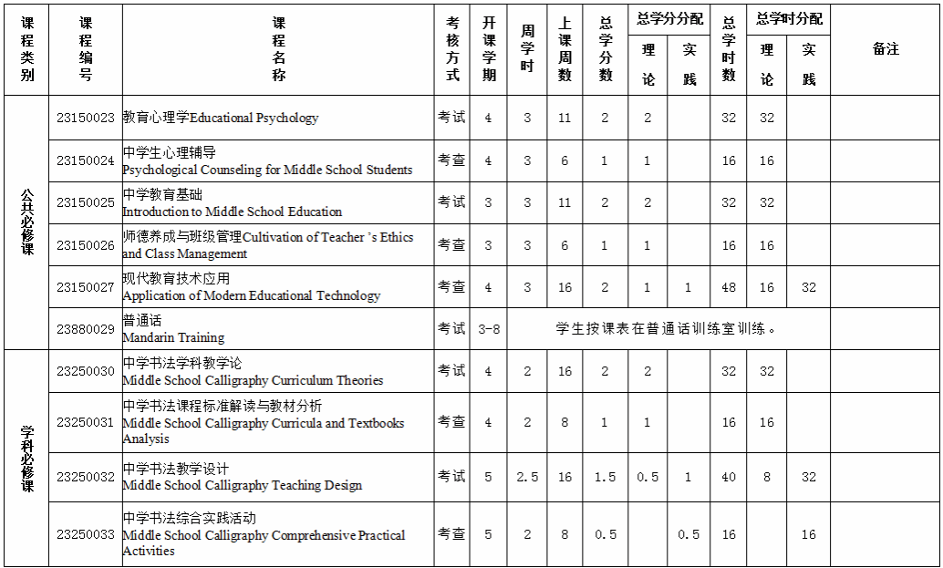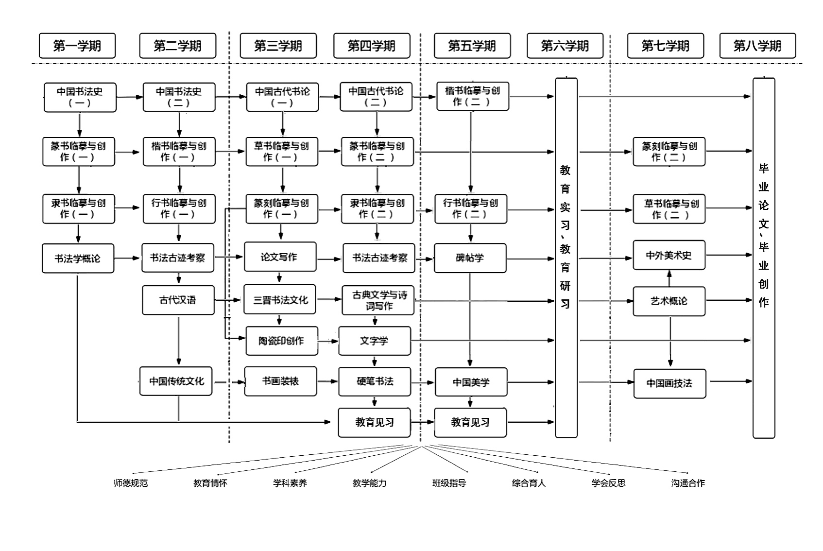 3.[学科素养]掌握书法学科基础知识、基本原理和基本技能,具备扎实的书法学专业功底,初步形成以书法学为核心和基础、以中学书法教育为指向的跨学科知识结构。了解书法学科与文史哲艺等相关学科的关系,体认书法学科在社会实践领域的应用场景,并具备一定的应用能力; 了解和掌握教育学、心理学、课程教学论等课程的相关知识。